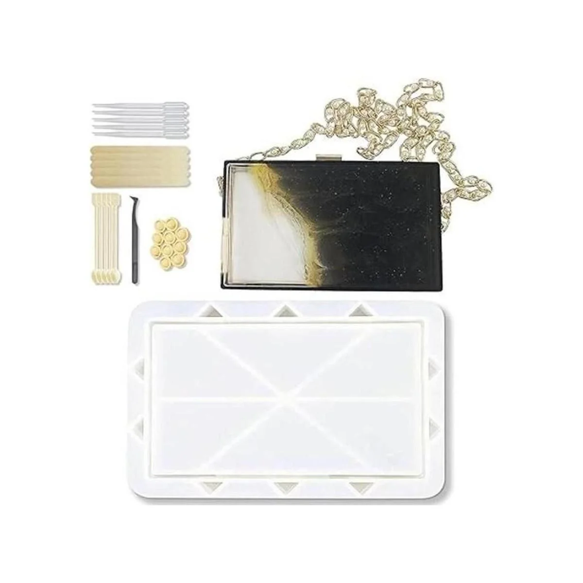 MUFUN Molde de resina para monedero, molde de embrague de resina rectangular, molde de bolsa de silicona para fundición de resina, moderno y único molde de bolsa de resina rectangular, suministros para manualidades, 1 molde de bolso de mano de resina con 26 herramientas