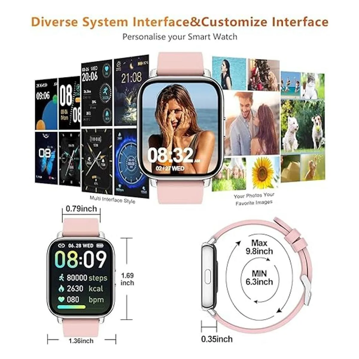 Relojes de fitness para mujer: el reloj inteligente tiene 24 modos de ejercicio, incluyendo actividades al aire libre e interior como correr, caminar, ciclismo, saltar, etc. Estos modos de ejercicio pueden ayudarte a rastrear mejor tu entrenamiento, como pasos, distancia, calorías y hacer que tu ejercicio diario sea más eficaz. Y el reloj rastreador de fitness es herramientas más prácticas como podómetro, música y control de cámara, visualización del clima, reloj despertador, cronómetro y reloj de búsqueda.