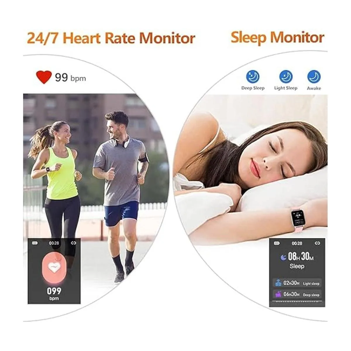 Monitor de frecuencia cardíaca y monitor de sueño: gracias al sensor de movimiento de alto rendimiento, el rastreador de actividad para mujeres puede controlar tu frecuencia cardíaca en tiempo real, puedes entender mejor tu condición. El monitor de sueño rastrea tu tiempo de sueño y etapa a través de un análisis completo de datos de calidad del sueño para ayudarte a captar mejor los cambios de salud, para que puedas ajustar tus hábitos y lograr un estilo de vida más saludable. El reloj no se puede utilizar para fines médicos