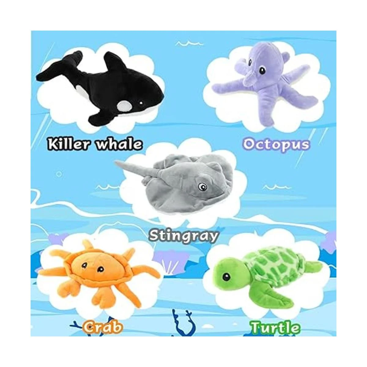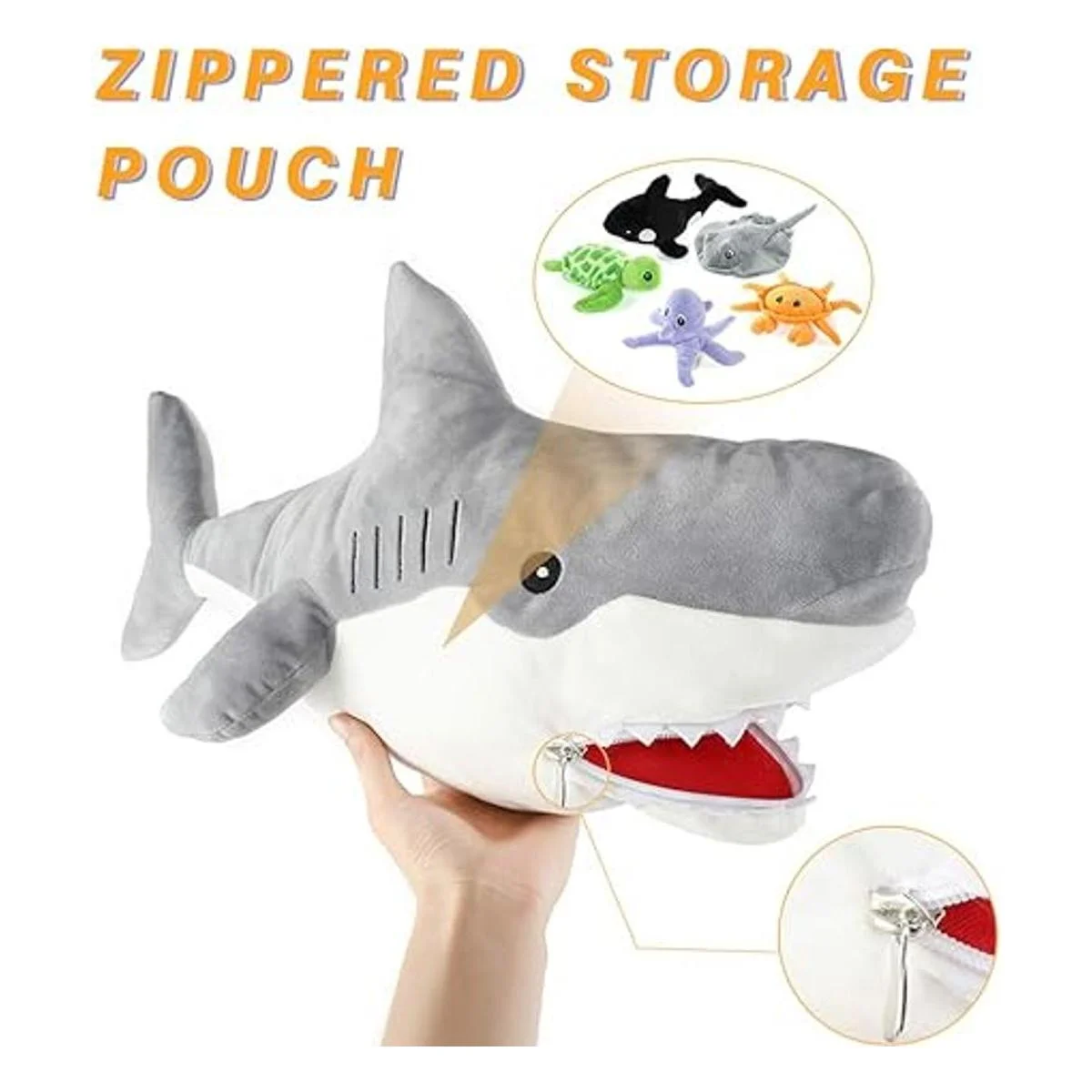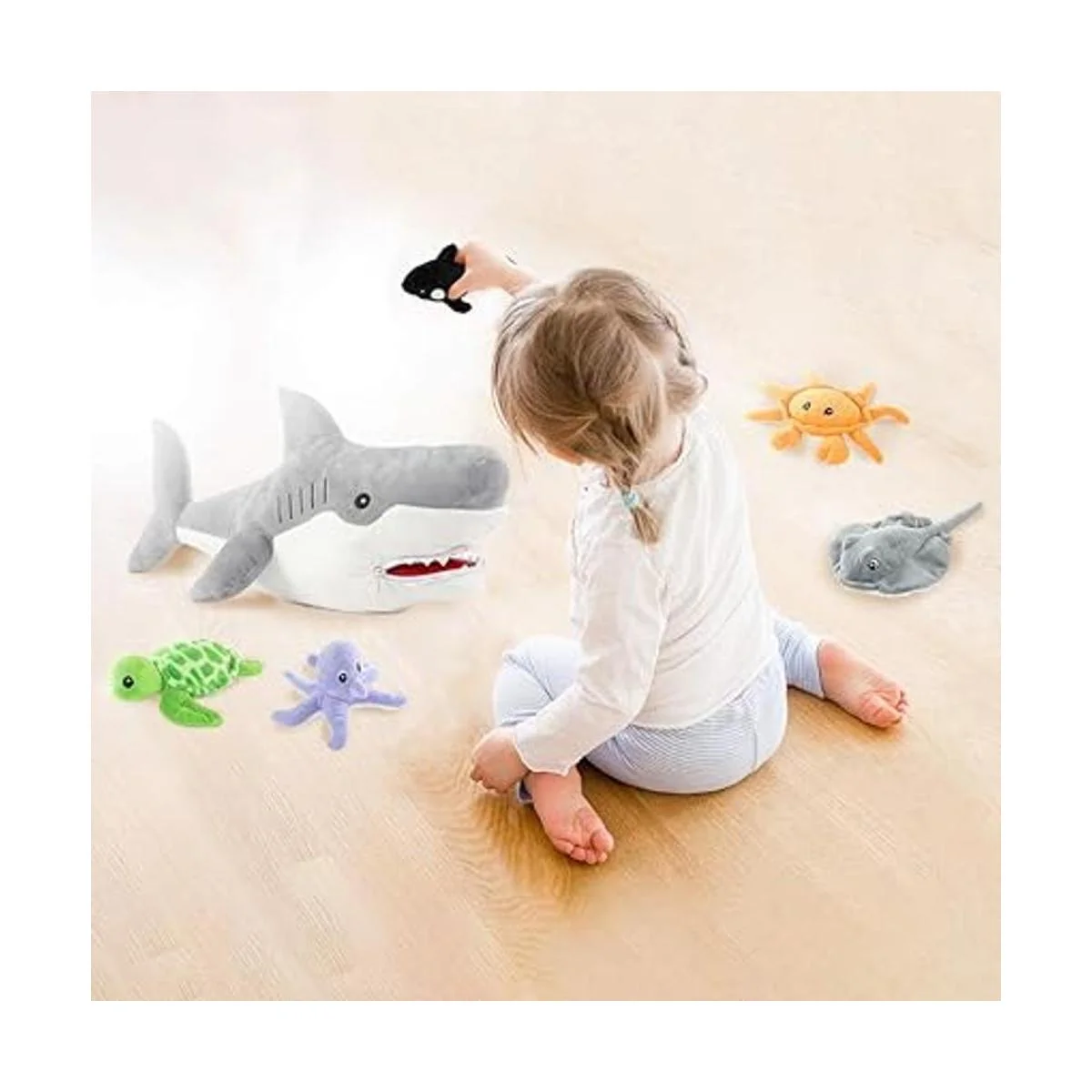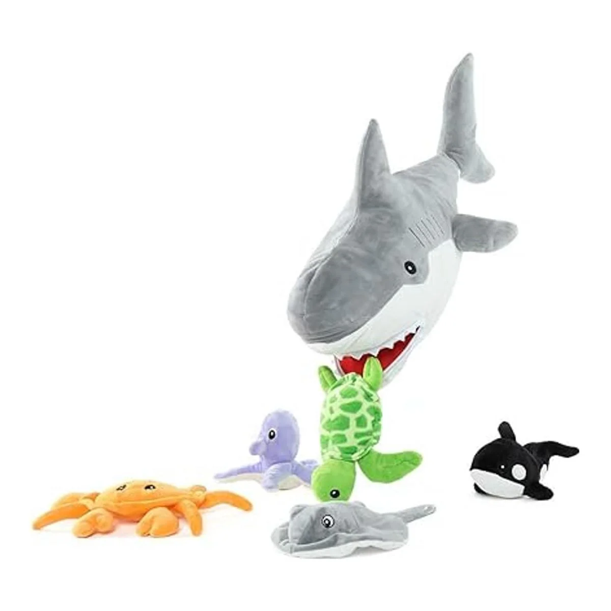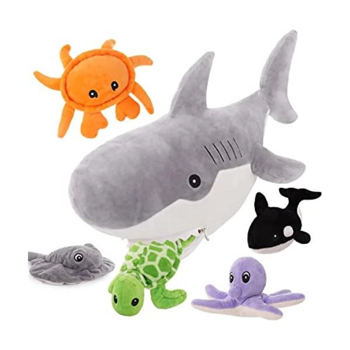 El producto contiene: un gran tiburón blanco de peluche de 23 pulgadas, cinco animales marinos de peluche diferentes pulpo, cangrejo, tortuga, rayo y ballena asesina