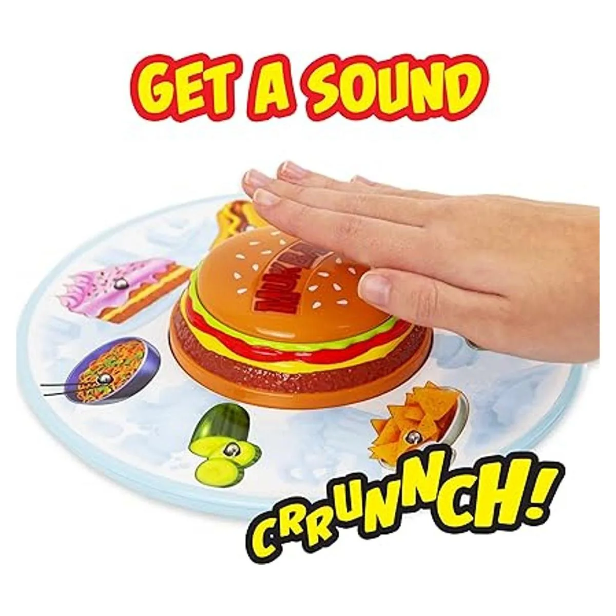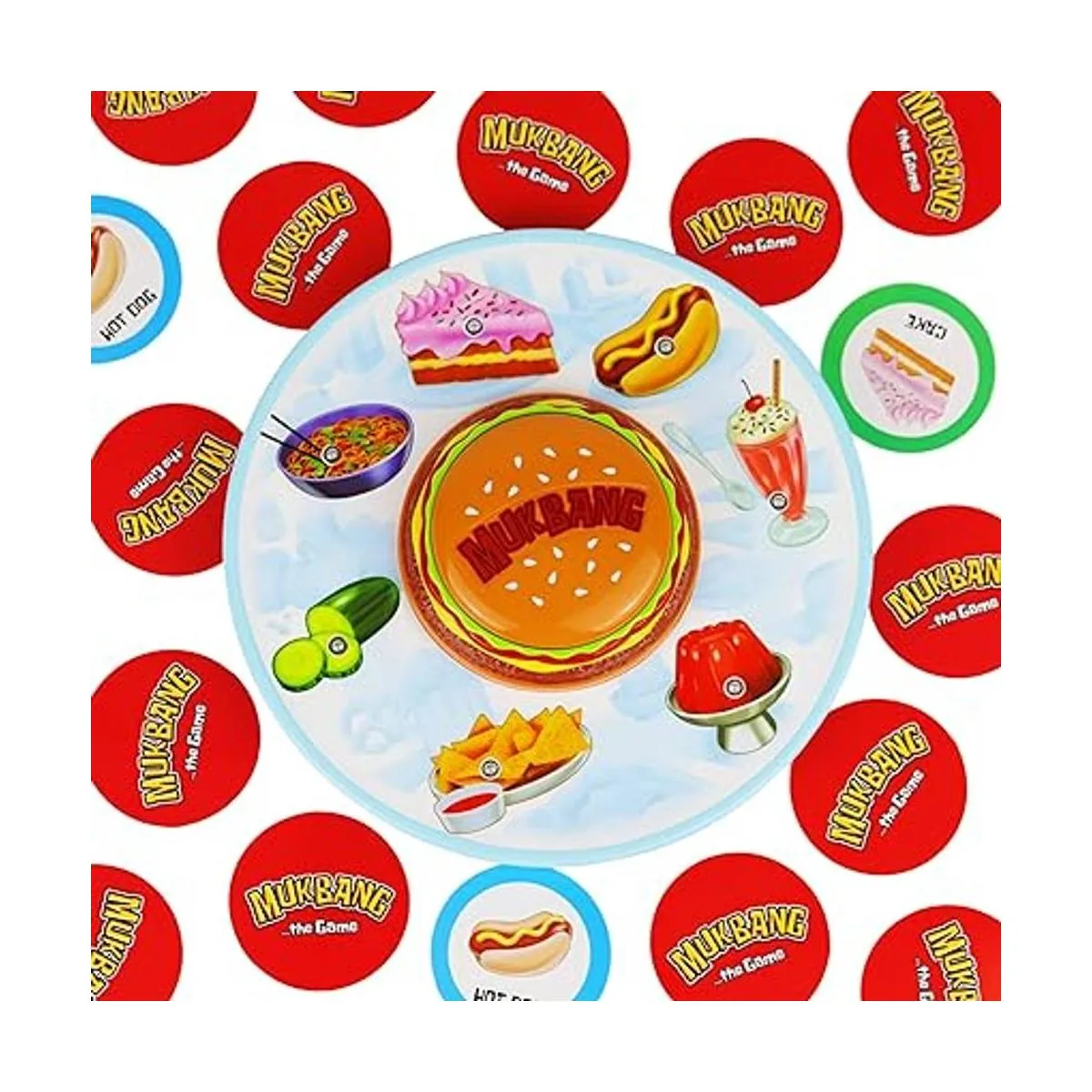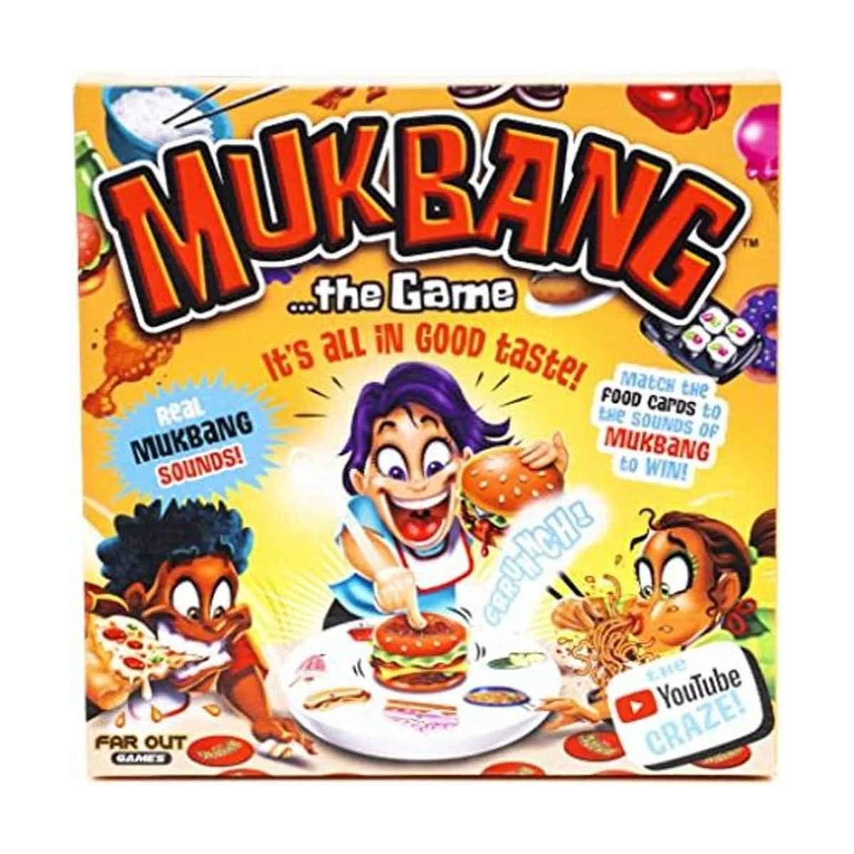 MUKBANG: The YOUTUBE CRAZE: inspirado en la locura de YouTube, Mukbang de Far Out Toys es el juego de memoria aleatoria de alta intensidad donde combinas tarjetas de comida con sonidos Mukbang procedentes de nuestra adorable unidad de juego electrónica en forma de hamburguesa de queso.