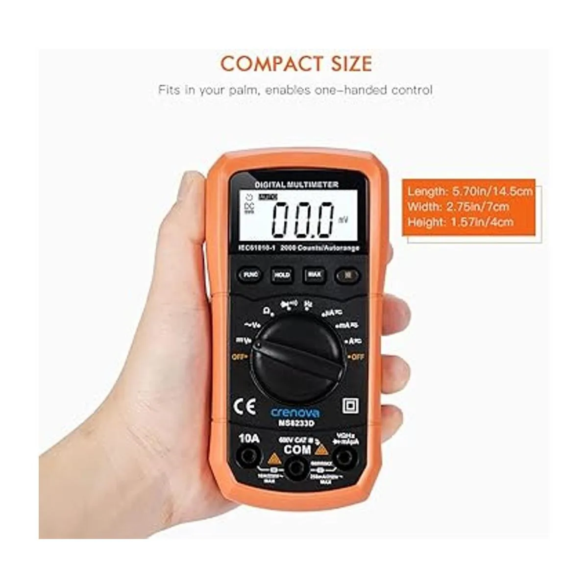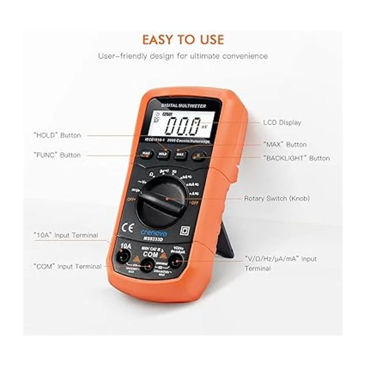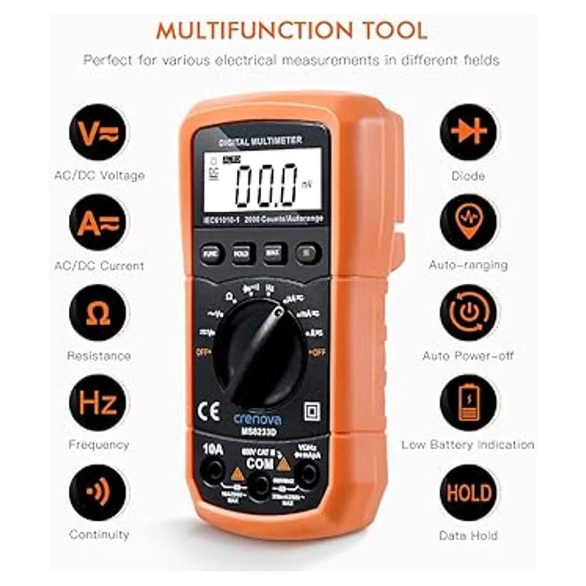 Multímetro digital con autorango Crenova MS8233D, instrumento de medición electrónica, detector de voltaje CA, medidor portátil de Amp Ohm Volt, multi tester cdiodo y escáneres de prueba de continuidad, para uso en el hogar, herramienta de mano electrónica con pantalla LCD de retro iluminación.