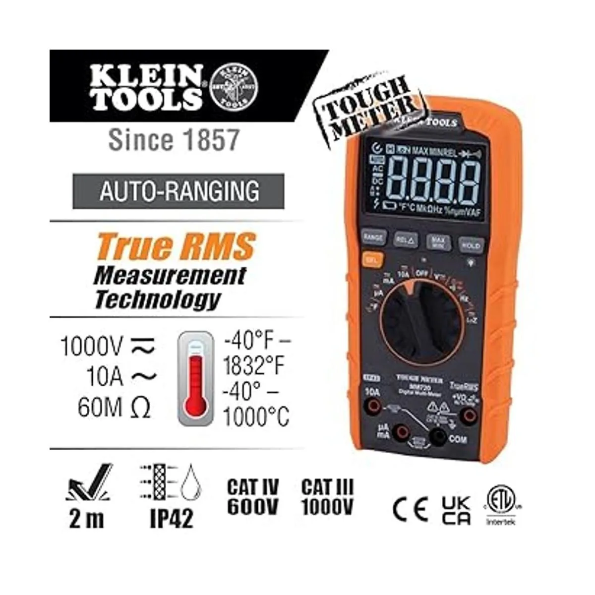 Multímetro digital, TRMS de rango automático, baja impedancia LOZ, voltaje de 1000 V CACC, corriente de 10 A CACC, resistencia a 60 MOhms Klein Tools MM720