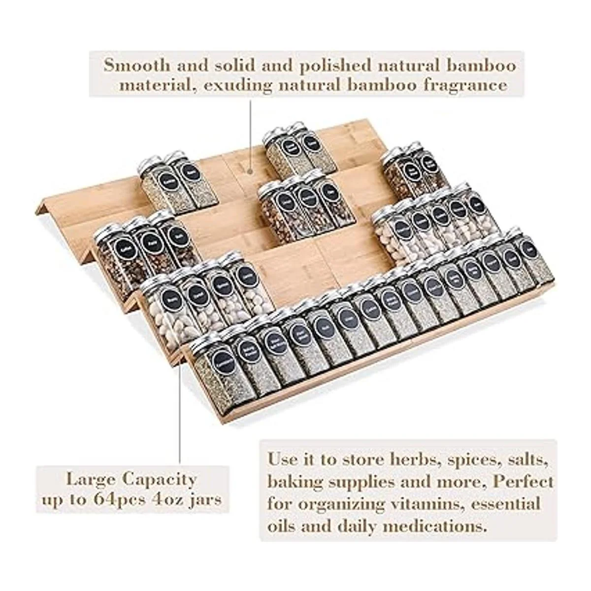 Mulush Bandeja de bambú para especias Organizador de cajones de especias de 64 tarros, para almacenamiento y organización de gabinetes de cocina