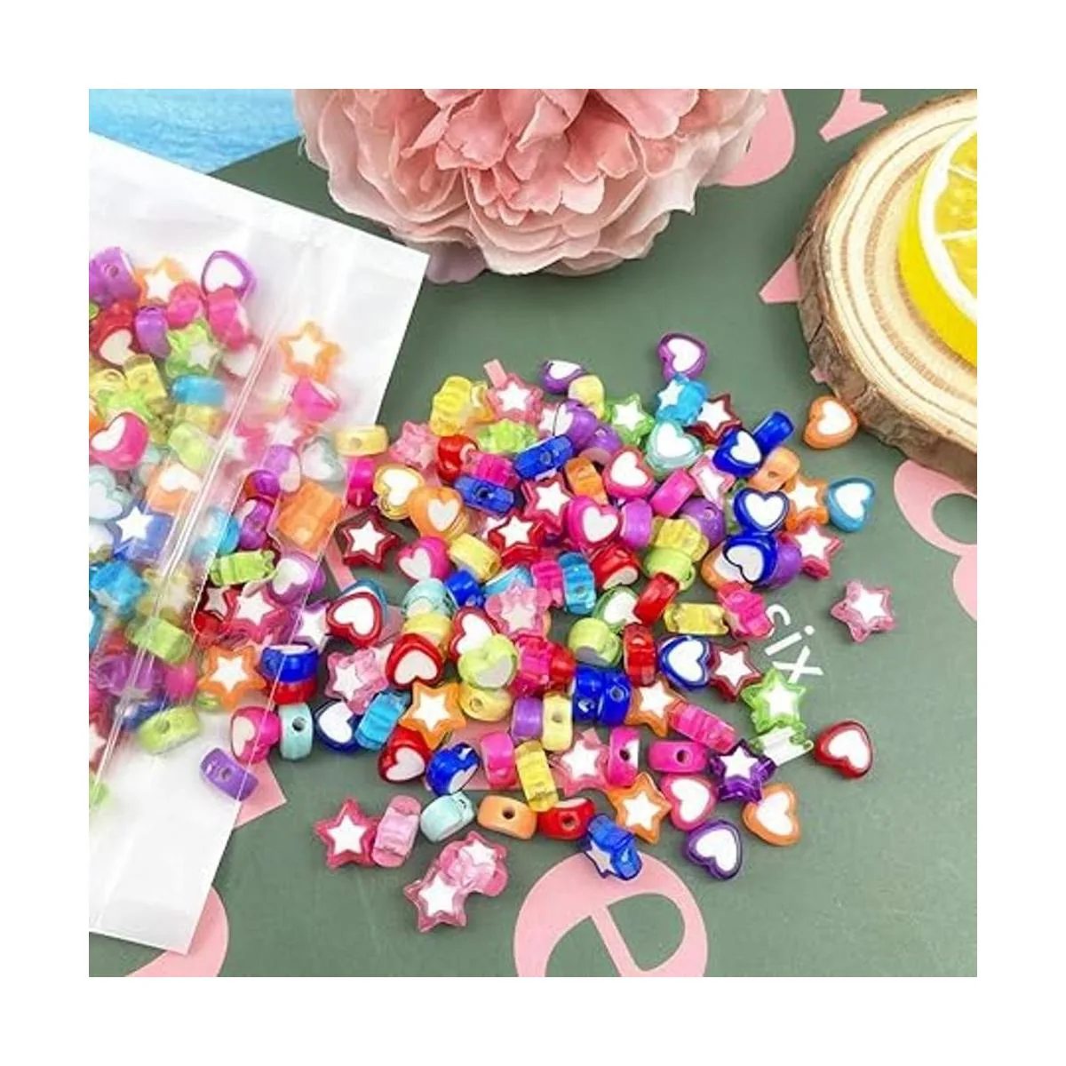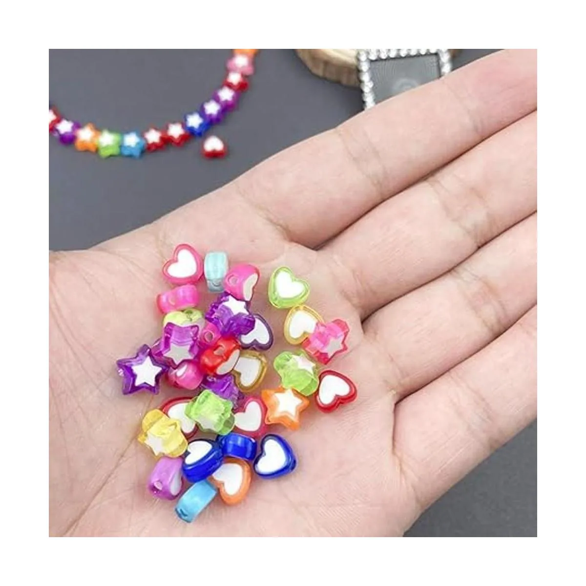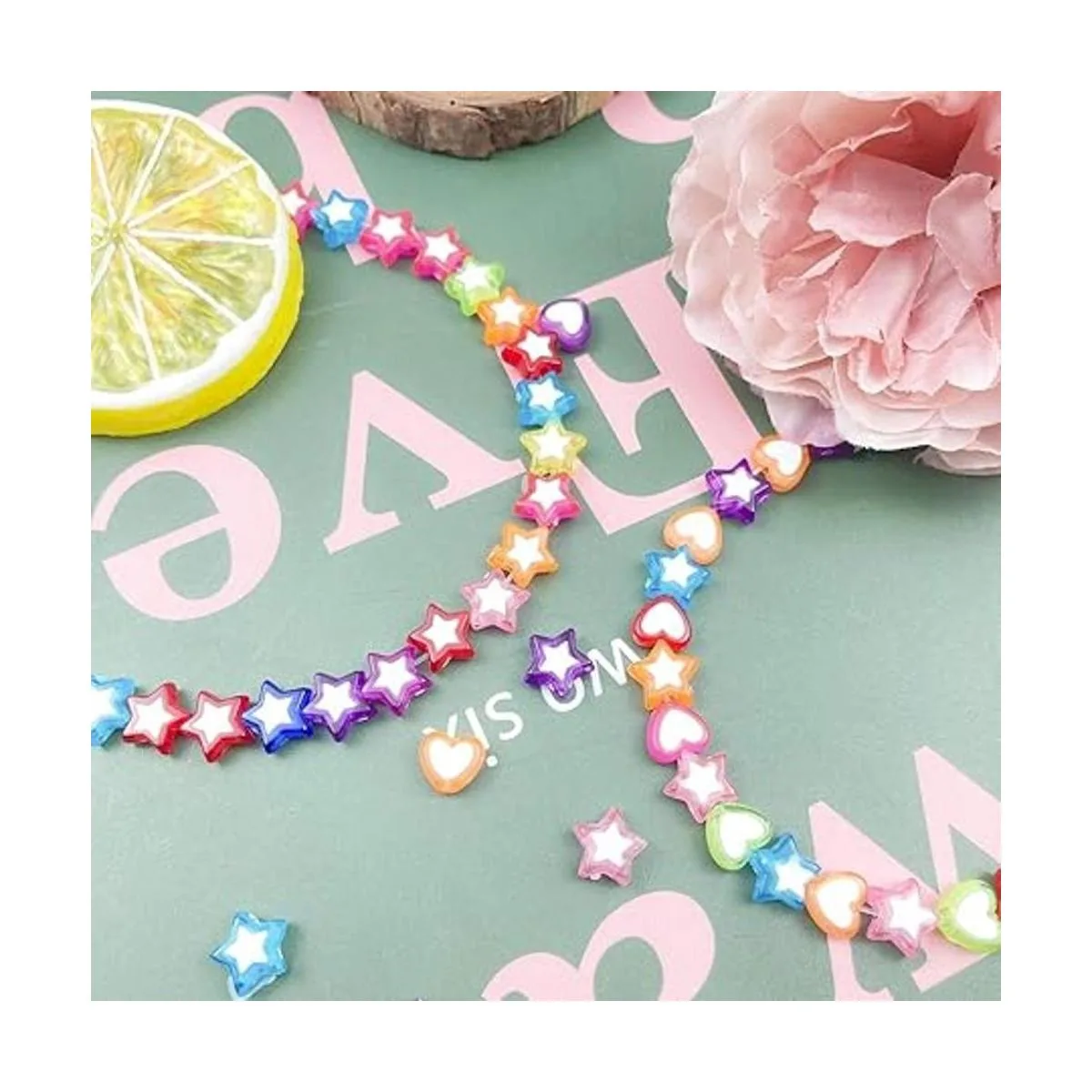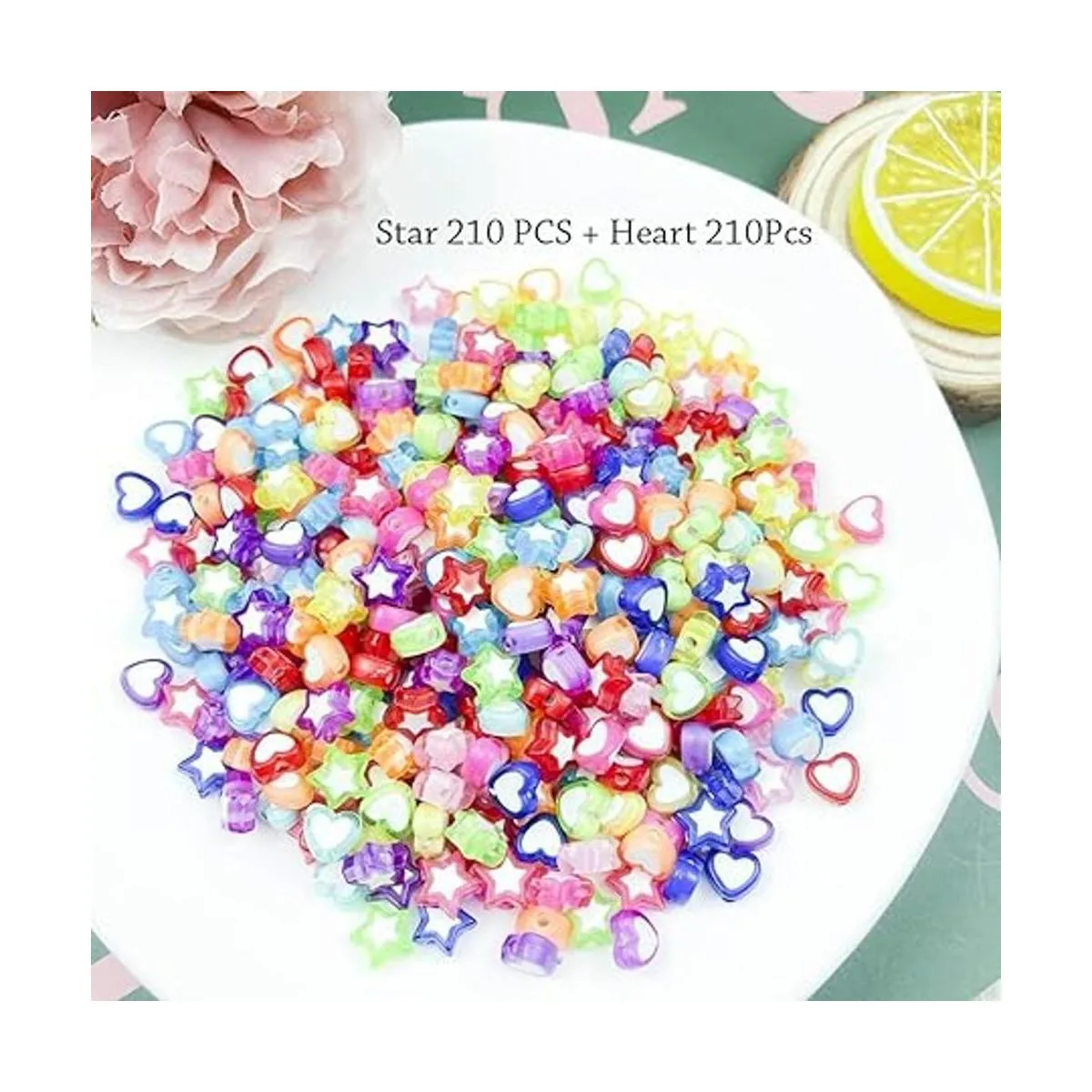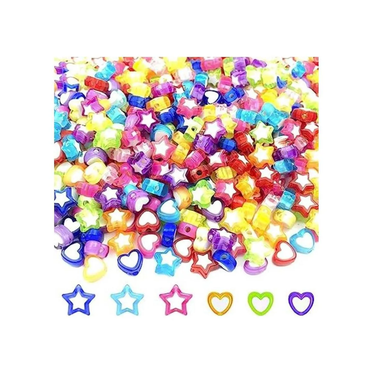 El paquete incluye: 420 cuentas acrílicas coloridas y transparentes en 2 estilos diferentes, forma de corazón y forma de estrella, 210 piezas para cada estilo, que satisfarán todo tipo de necesidades de bricolaje.