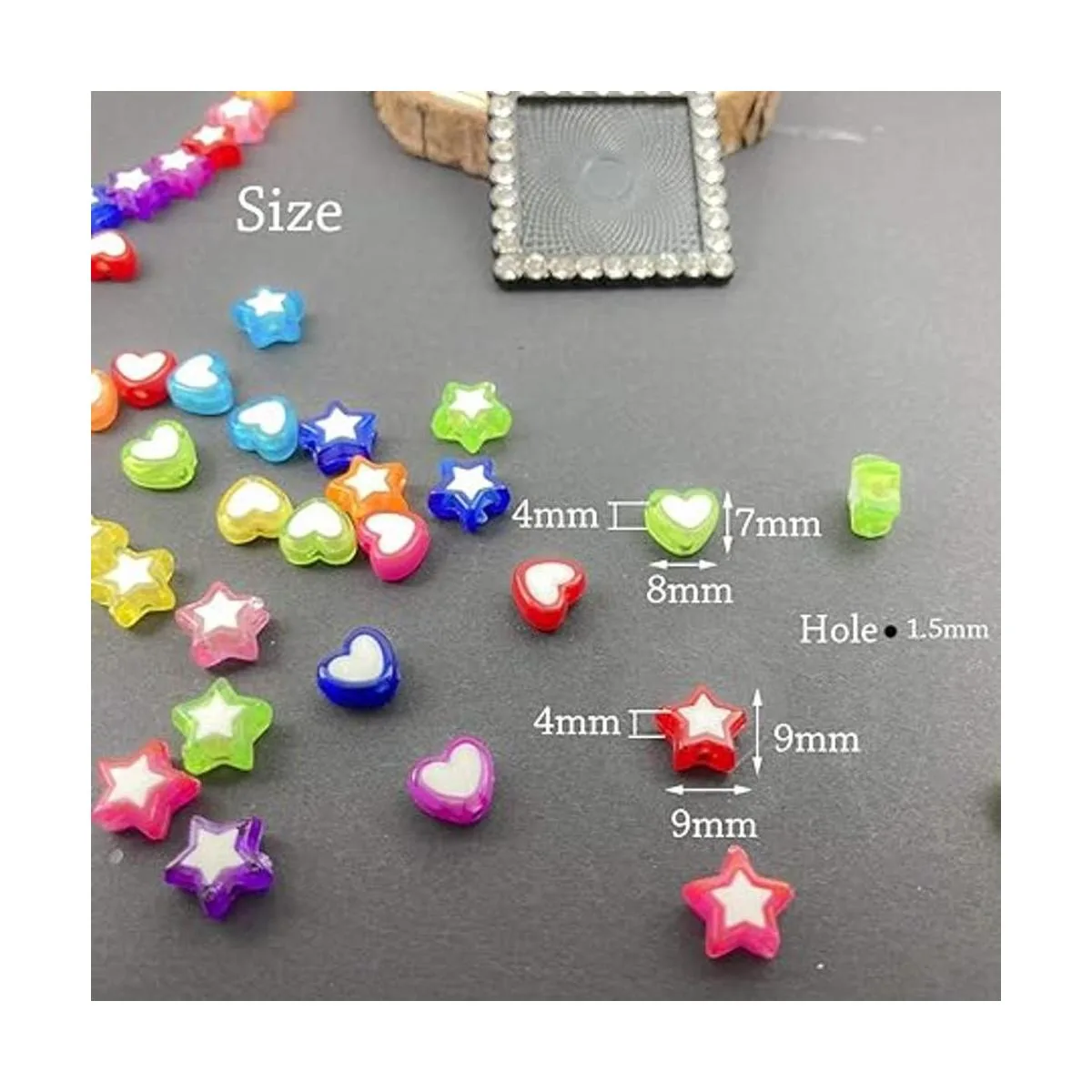 Tamaño: las cuentas de estrella son de 0.354 in x 0.354 in, las cuentas de corazón son de 0.276 in x 0.315 in. El grosor es de 0.157 in, el agujero es de 0.059 in.