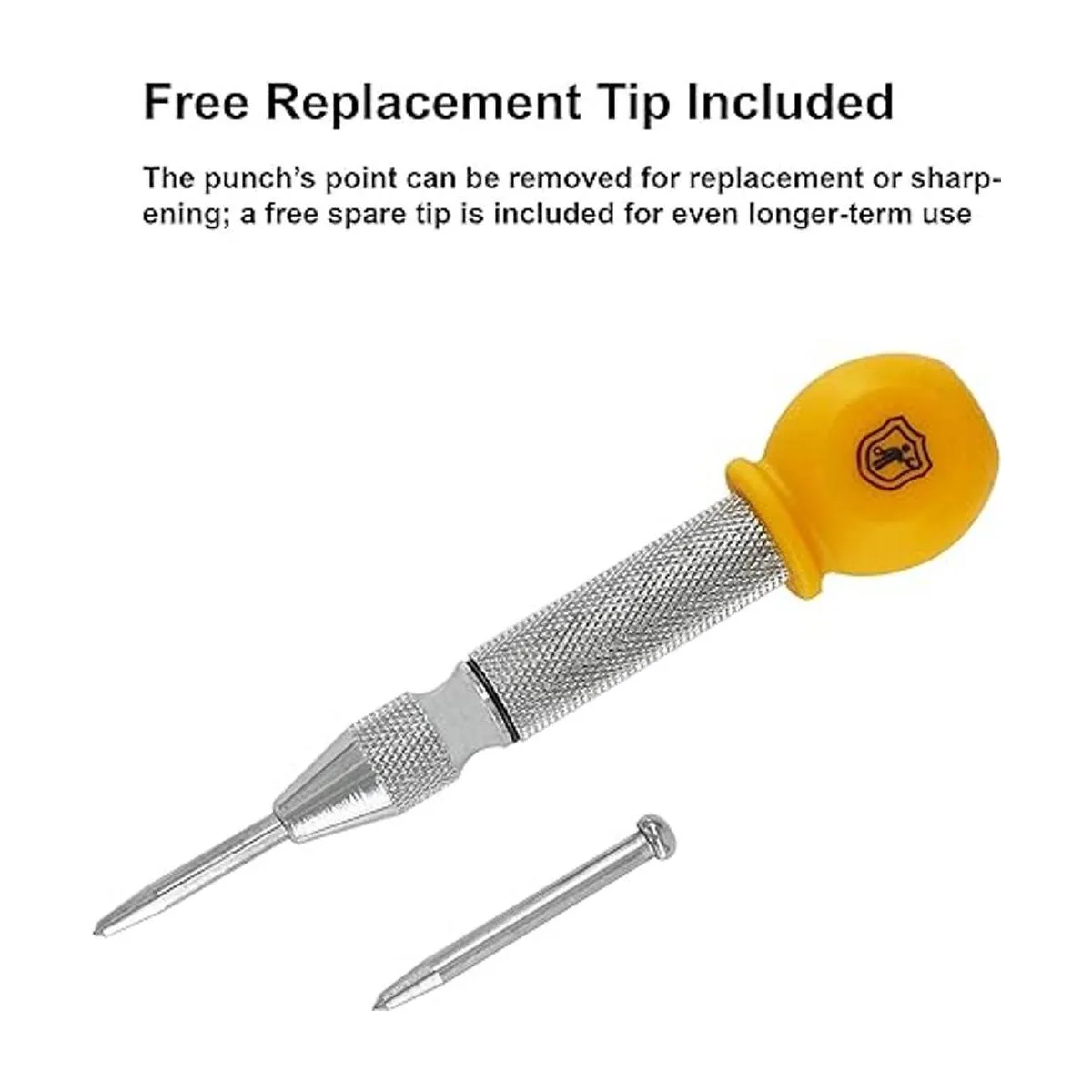 MulWark Punzón automático de acero con resorte de 5.0 in para madera, metal, plástico, herramienta de interruptor para ventana de coche, con tapa de cojín de palma, impacto ajustable, punta de repuesto incluida
