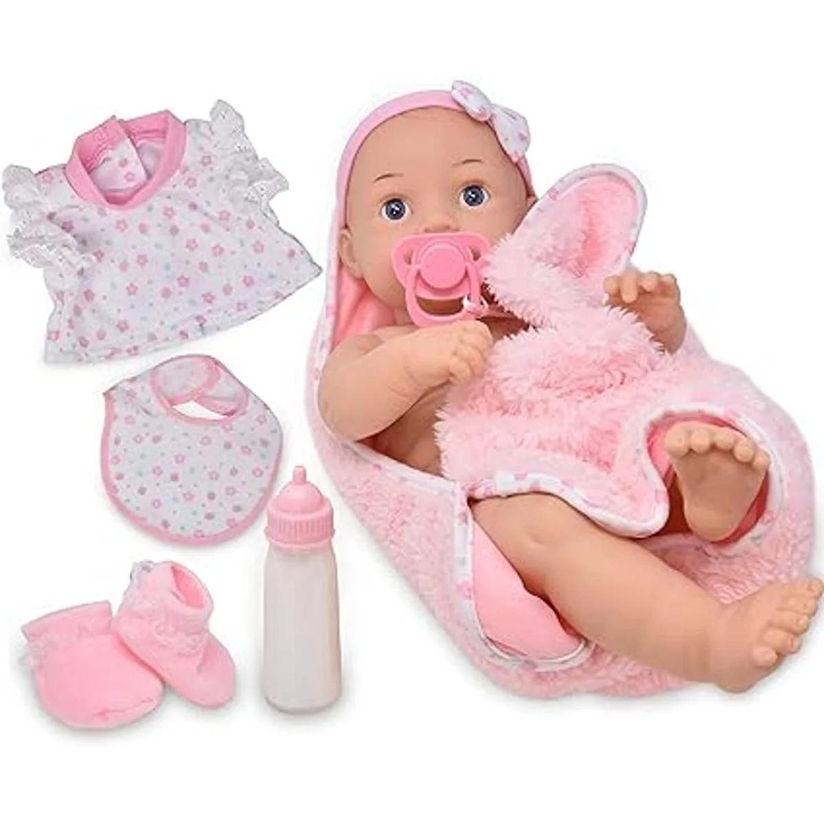 El juego incluye: muñeca de bebé realista de 16 pulgadas, botella de leche mágica que desaparece, babero, traje de bebé, chupete, manta. Nota: los colores pueden variar