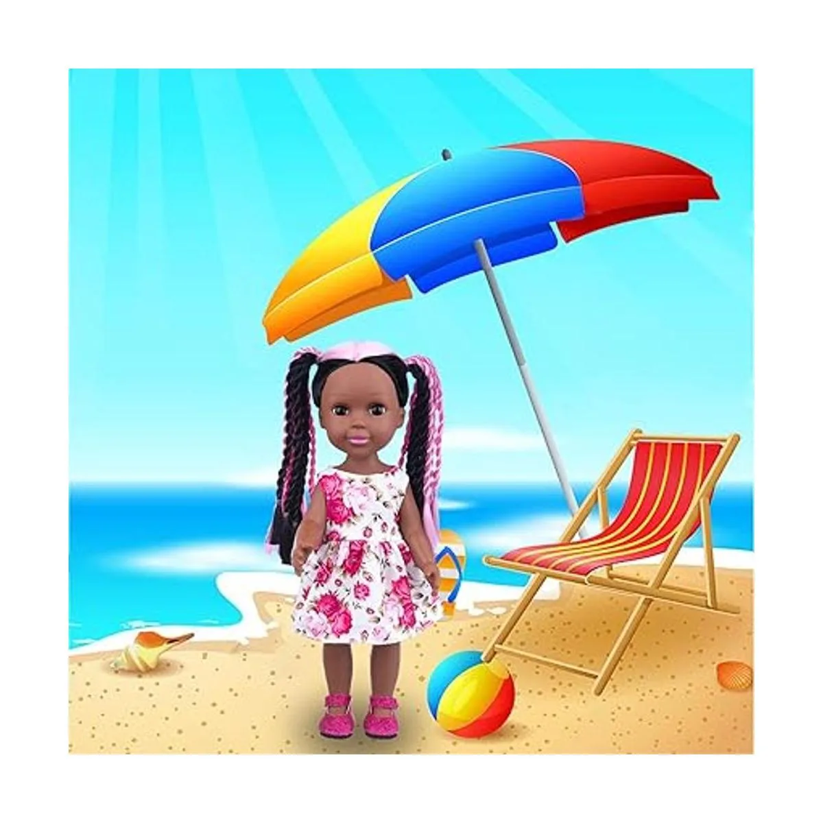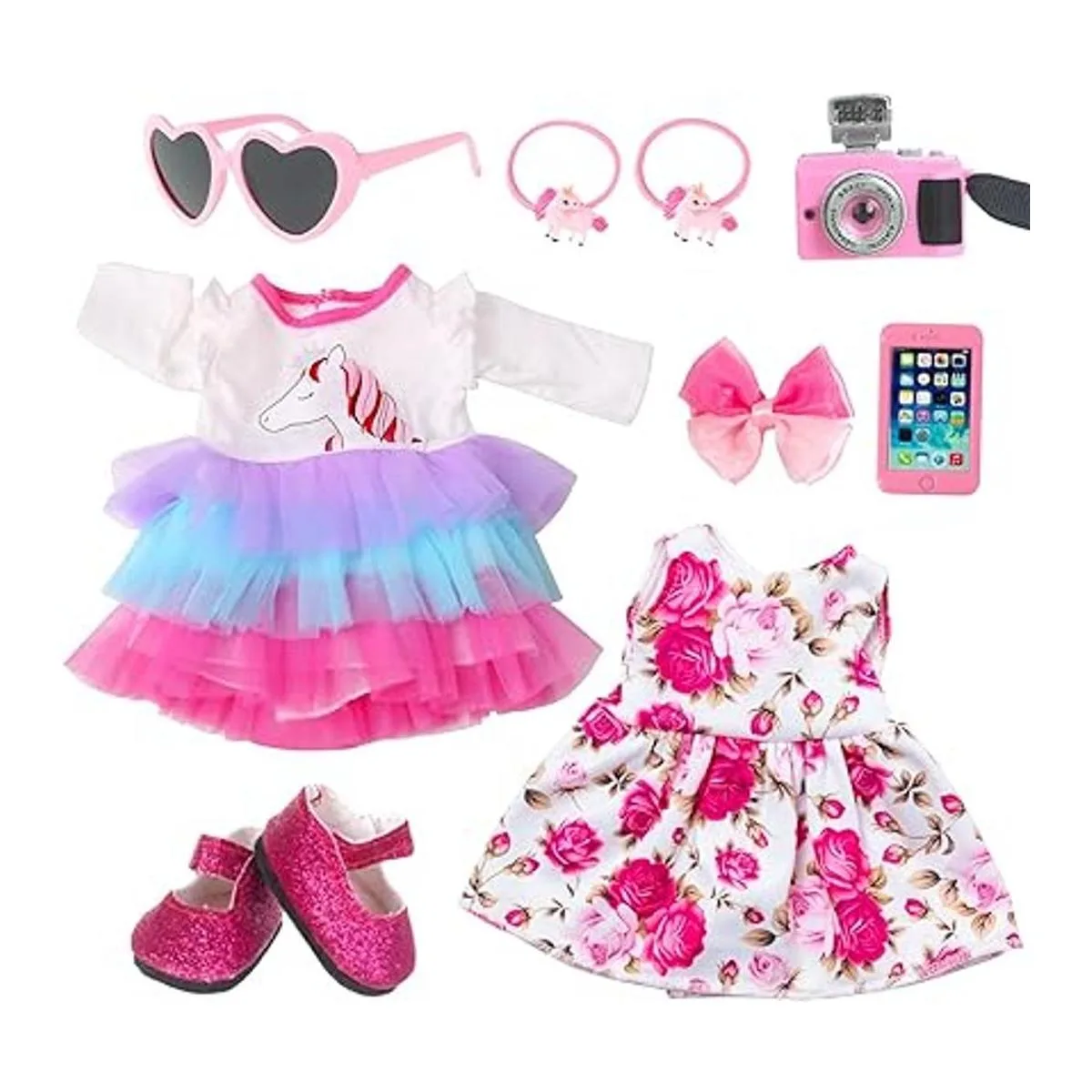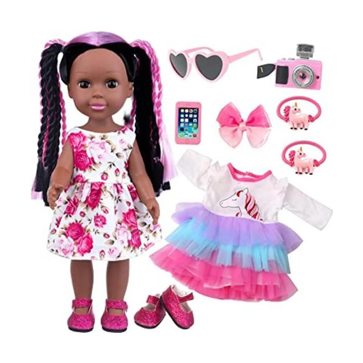 El paquete incluye: muñeca de niña de 14.5 pulgadas, 2 juegos de ropa de muñeca, 1 par de zapatos, 1 cámara, 1 gafas de sol, 1 horquilla, 1 teléfono, 2 anillos para el cabello.