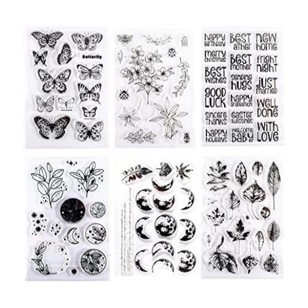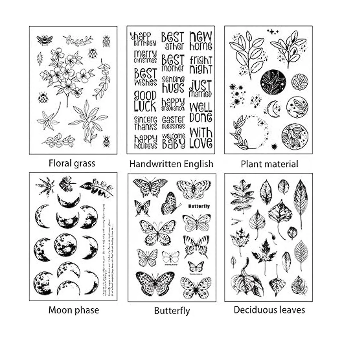 Muulaii 6 hojas de tarjetas de sello de silicona transparente con palabras de felicitación, flores, hojas, mariposas y lunas patrón para Acción de Gracias, Navidad, Navidad, Navidad, Navidad, Navidad, Navidad, álbumes de recortes, diario