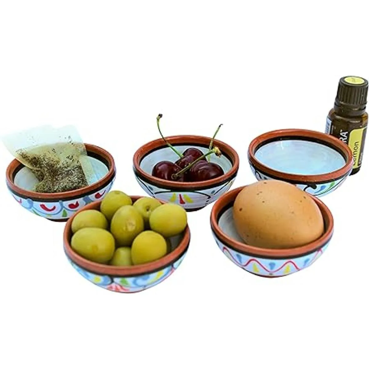 Cuencos muy pequeños: perfectos para condimentos, especias, aceitunas, té o sal, estos deliciosos mini cuencos de terracota cada uno tiene capacidad para menos de 1/4 taza o 2 onzas líquidas son aptos para lavavajillas, microondas y alimentos. Miden 2.75 pulgadas en la parte superior.