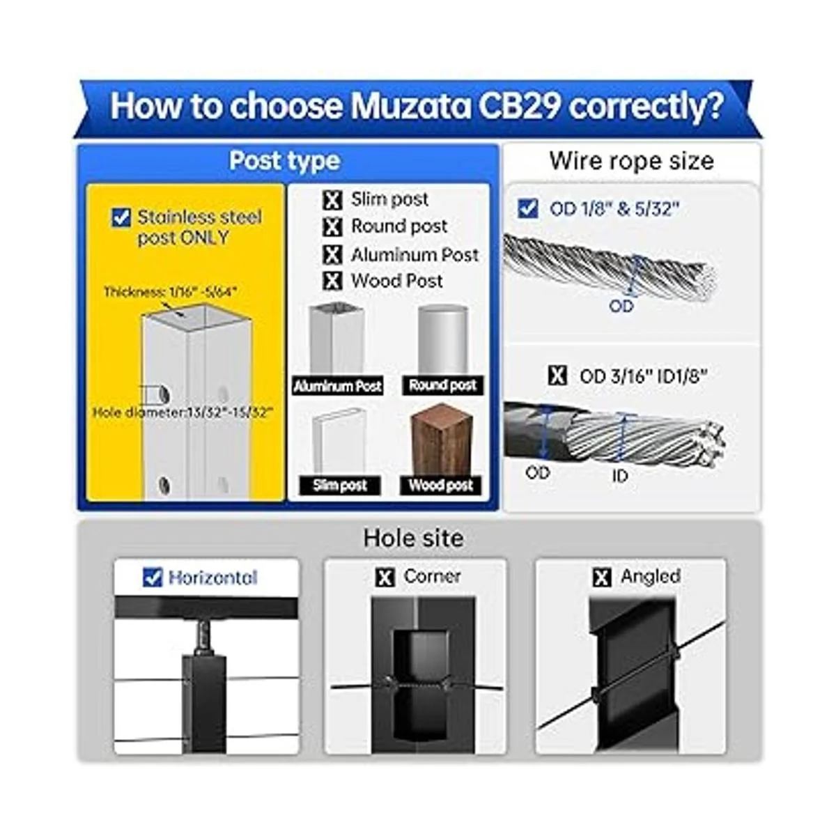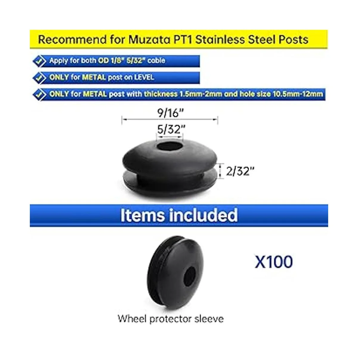 Diseño de patente protector y decorativo: este kit de barandilla de cable negro está diseñado patentemente para cubrir los agujeros en postes de metal intermedios horizontalmente, creando un aspecto limpio y evitando la abrasión del cable. Recomendado para ser utilizado con postes de acero inoxidable Muzata PT1. Nota: solo para postes de metal con grosor de 0.059 in a 0.079 in y tamaño del agujero de 0.413 in a 0.472 in en nivel; solo para cable OD de 1/8 pulgadas o 5/32 pulgadas. El paquete incluye: 100 fundas protectoras