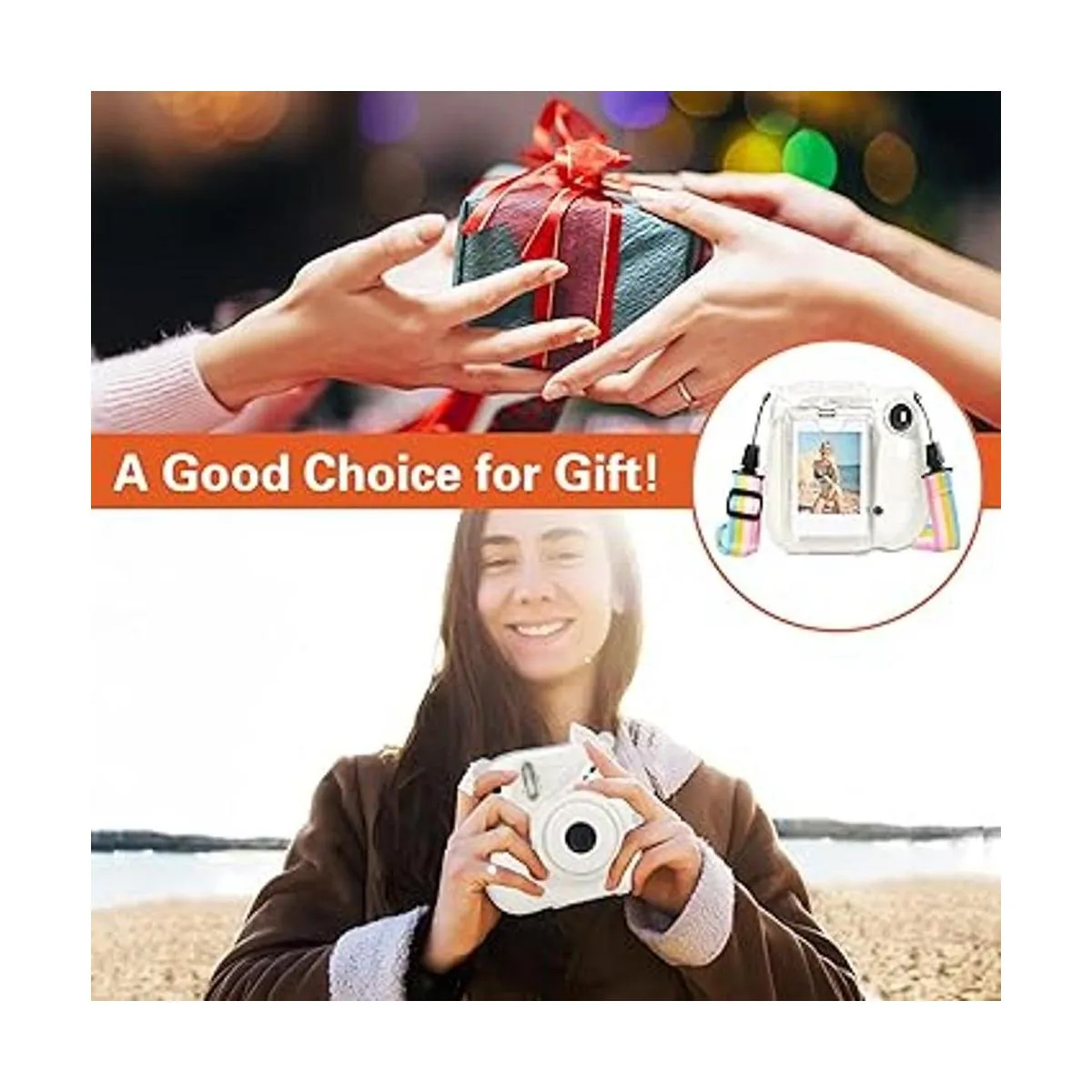Contenido del paquete: 1 funda transparente Mini 7 Plus/Mini 7 con bolsillo para fotos y 1 correa para el hombro la cámara y otros accesorios no están incluidos