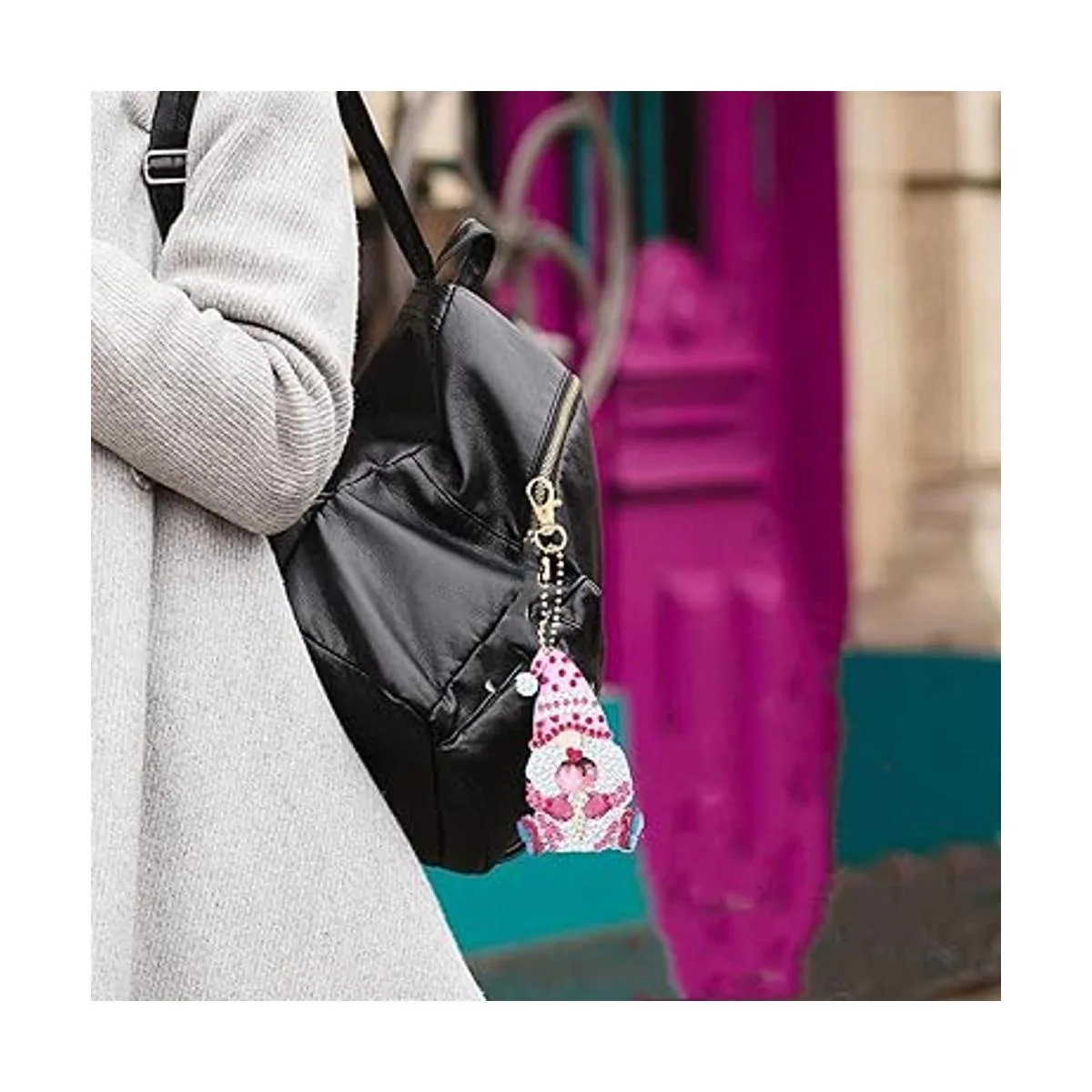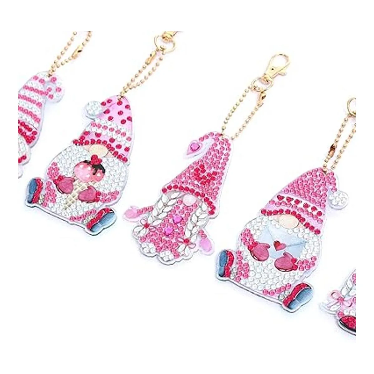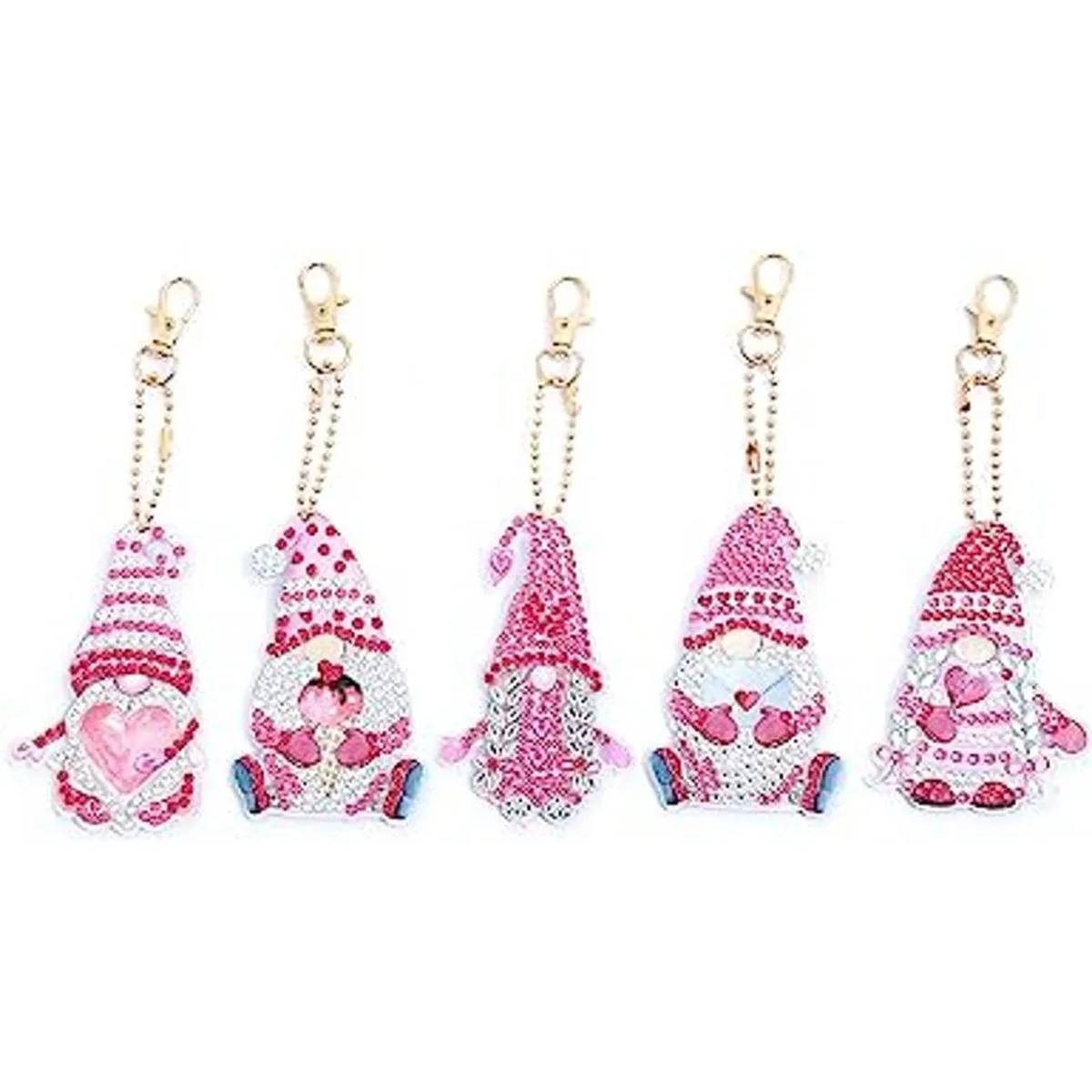Mwoot Kit de 5 llaveros de pintura de diamantes 5D de doble cara, diseño de diamantes de imitación para manualidades, taladro redondo enano, bonito llavero de gnomo de cristal, llavero de pintura de diamantes de imitación, colgante para mujer, mochila móvil, decoración de bolsos rosa, Rosado