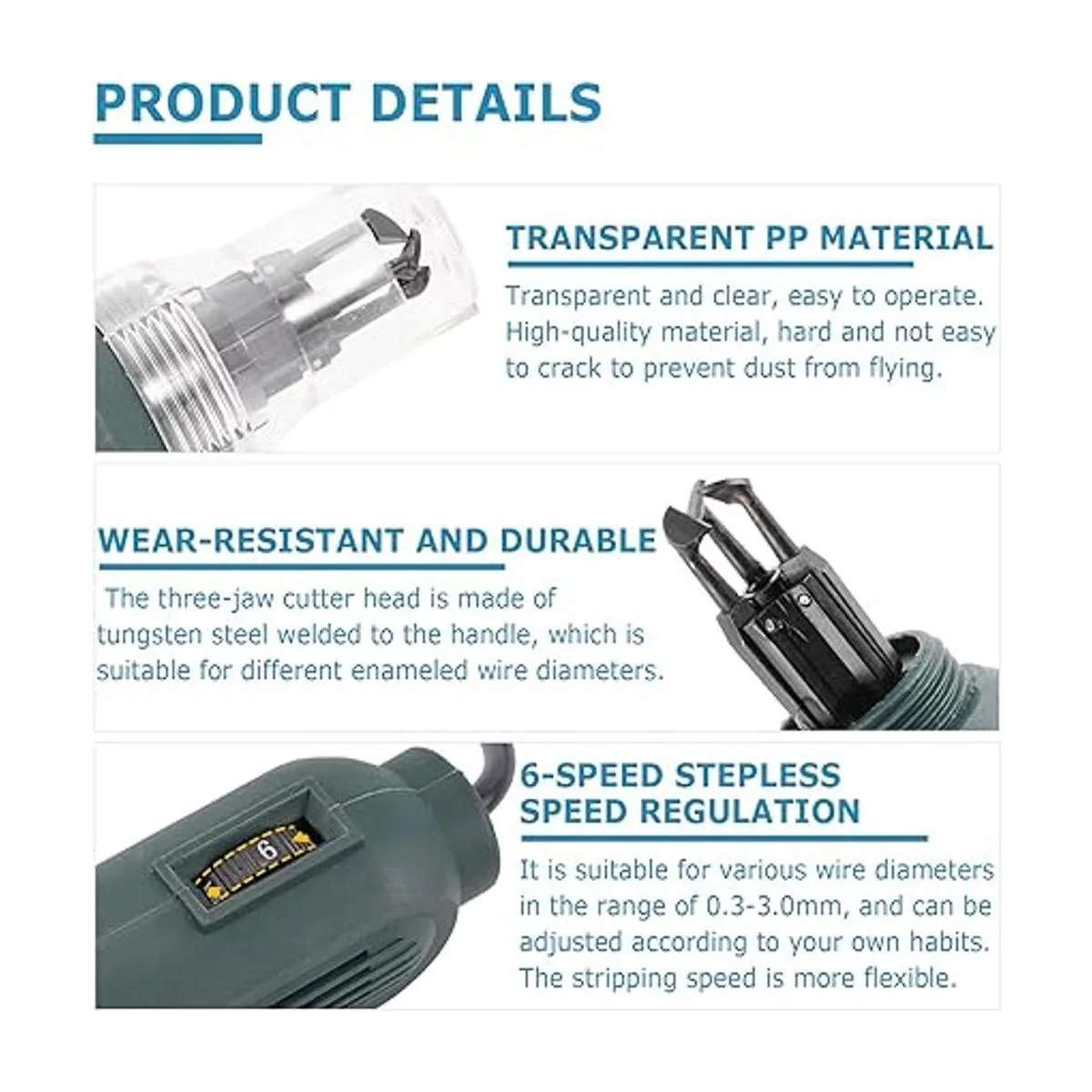 Esta máquina peladora de cables magnéticos se compone de un regulador electrónico de velocidad continuo, un motor de serie monofásico y un cabezal de corte de tres mandíbulas. Adopta un interruptor de micropunto ligero y duradero y un cepillo de carbono giratorio.