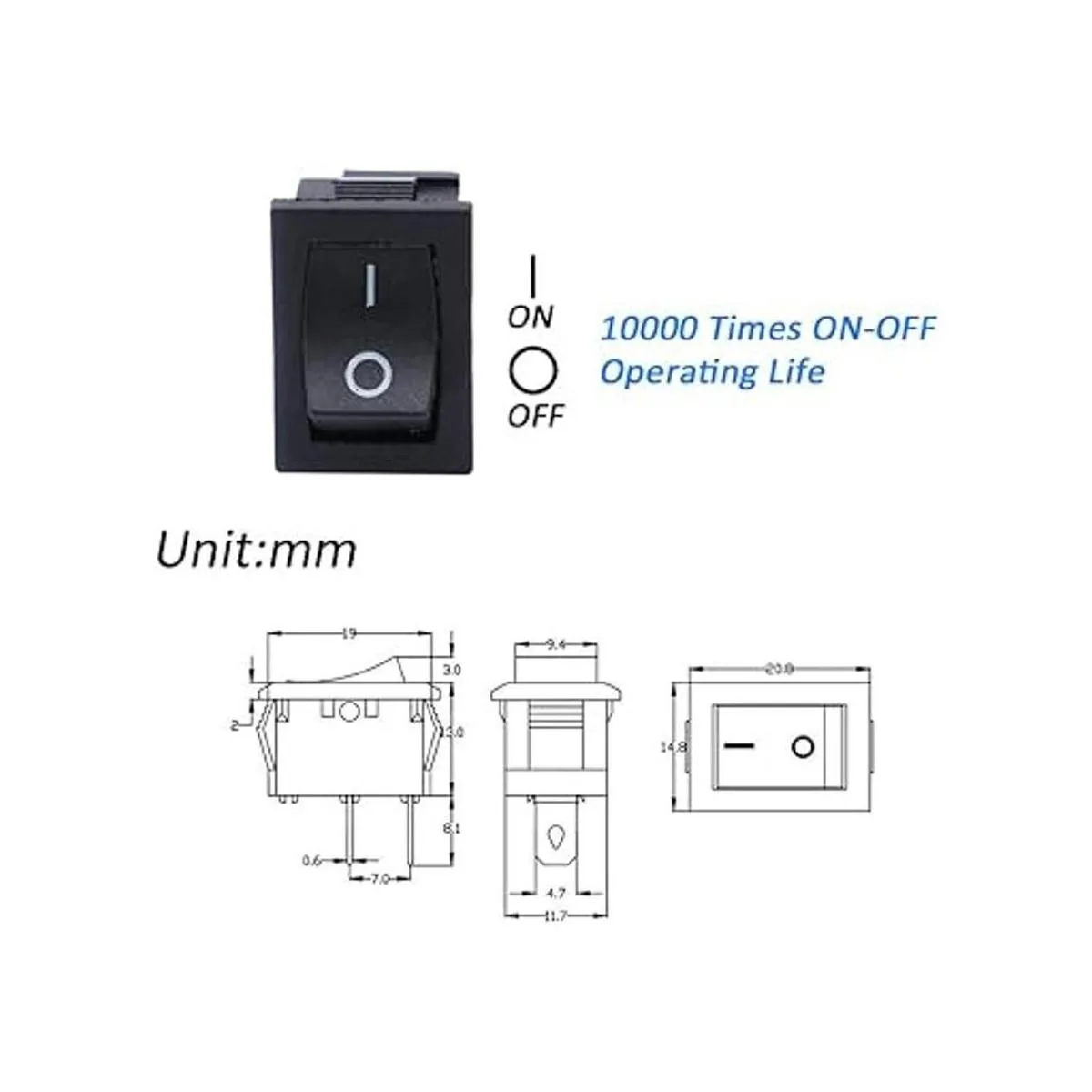 Nombre del producto: interruptor basculante. El interruptor basculante está hecho de poliamida de alta calidad eP nailon PA66, anticorrosión, ácido, alcalino y resistente al calor, los terminales son plateados, nuevos y de larga vida útil.