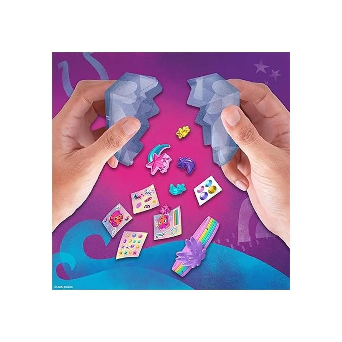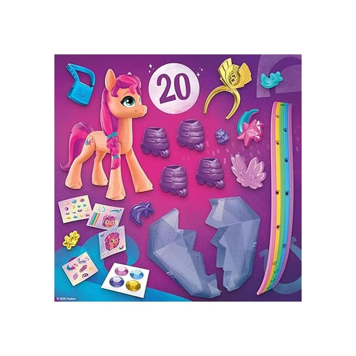 20 piezas: viene con figura de pony, recipiente en forma de cristal, pulsera de la amistad, 7 abalorios, 4 hojas de calcomanías, corona, bolsa de sillín, 4 accesorios de patinaje sobre ruedas y tatuaje temporal para niños