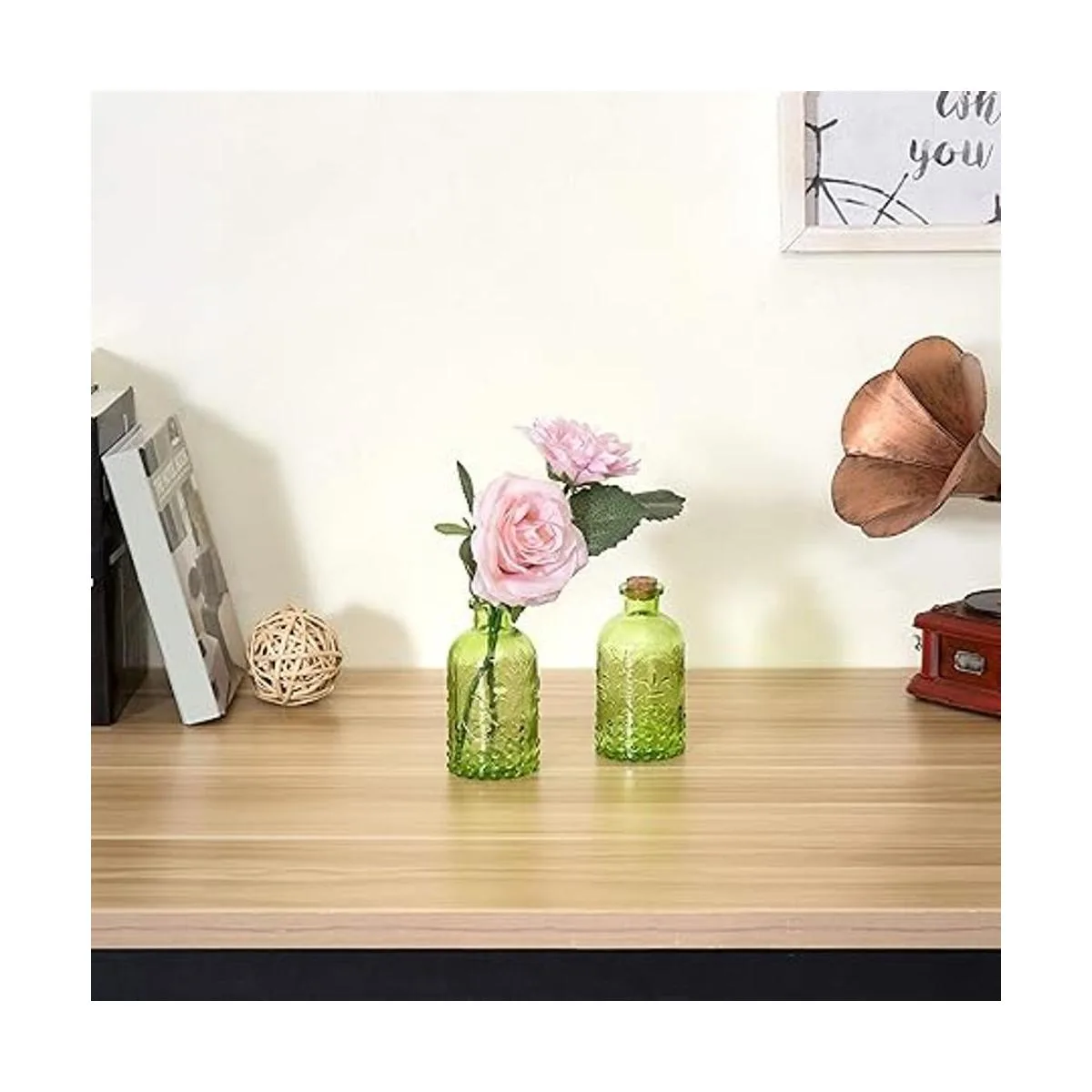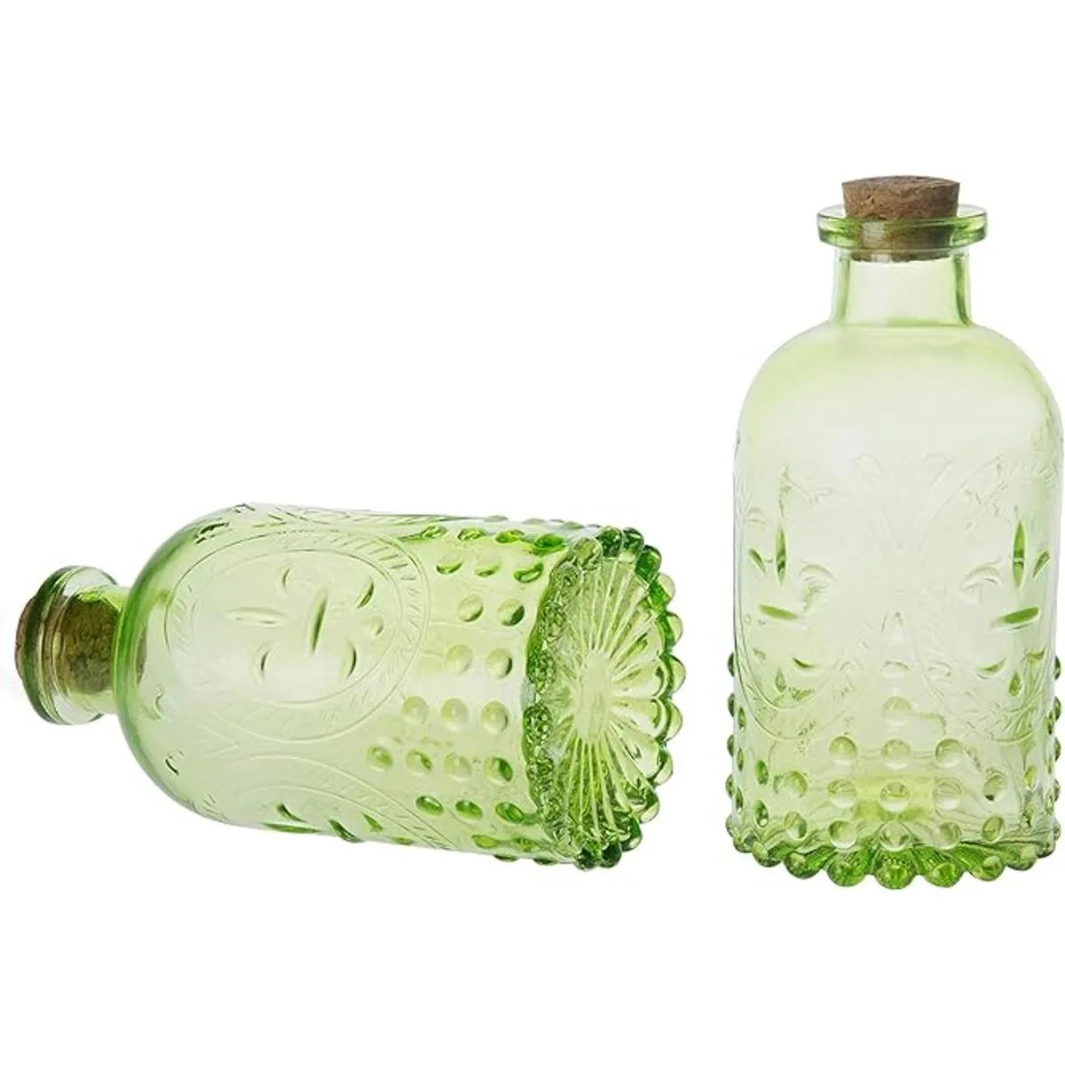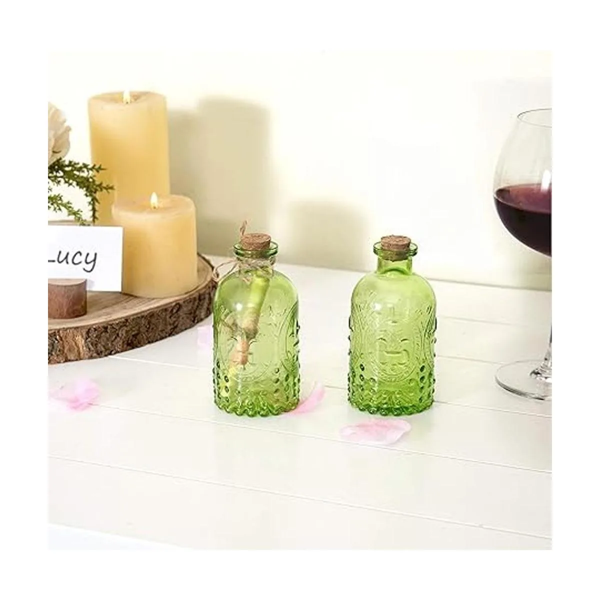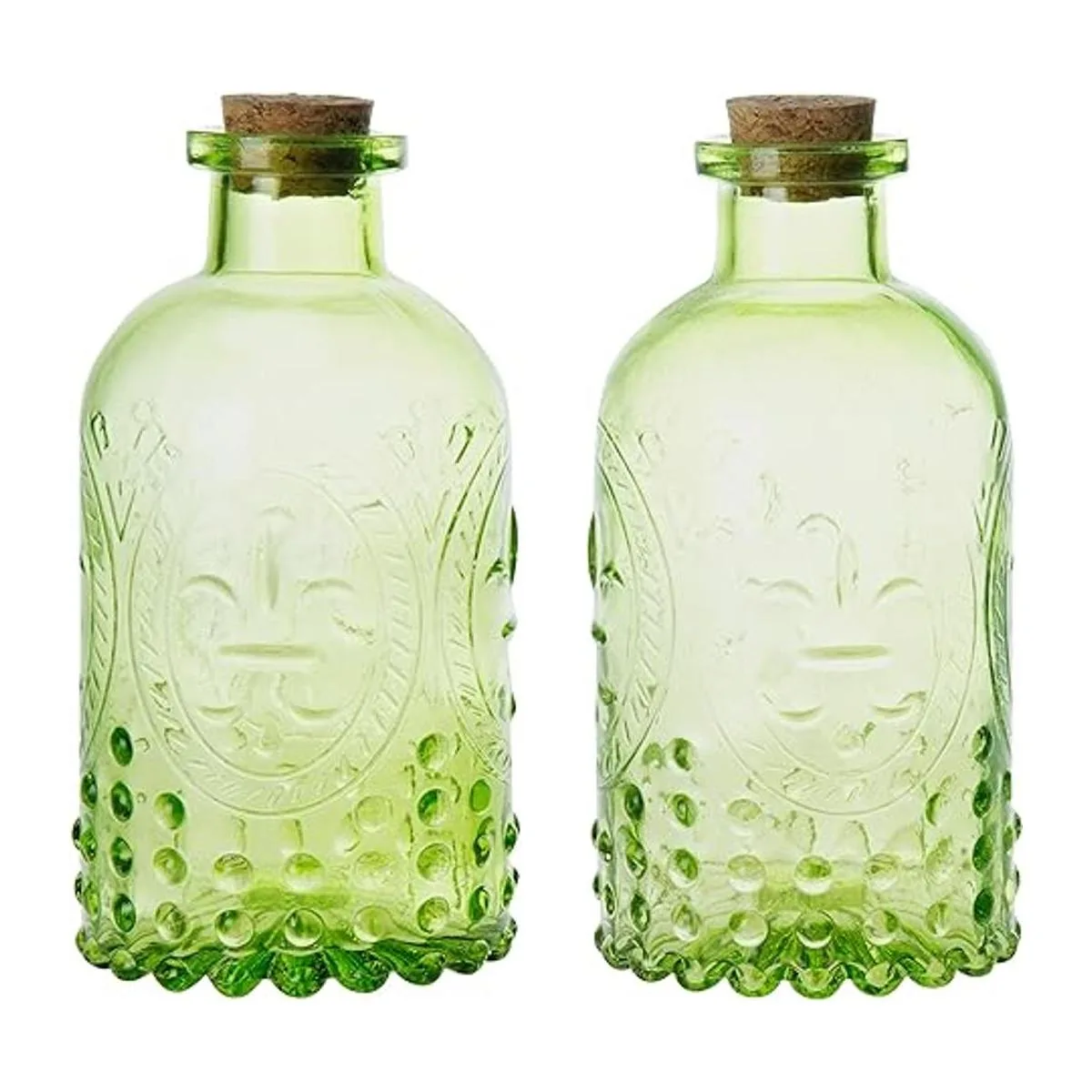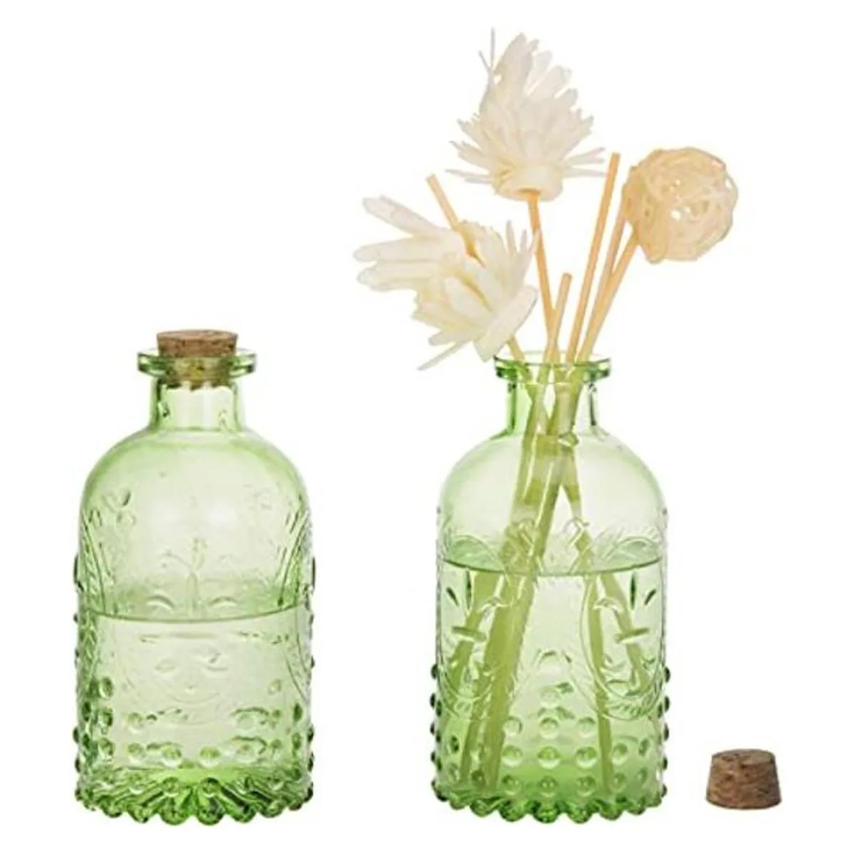 MyGift Botella difusora de varillas pequeña de vidrio verde en relieve vintage con tapa de corcho, jarrón decorativo de flores, juego de 2