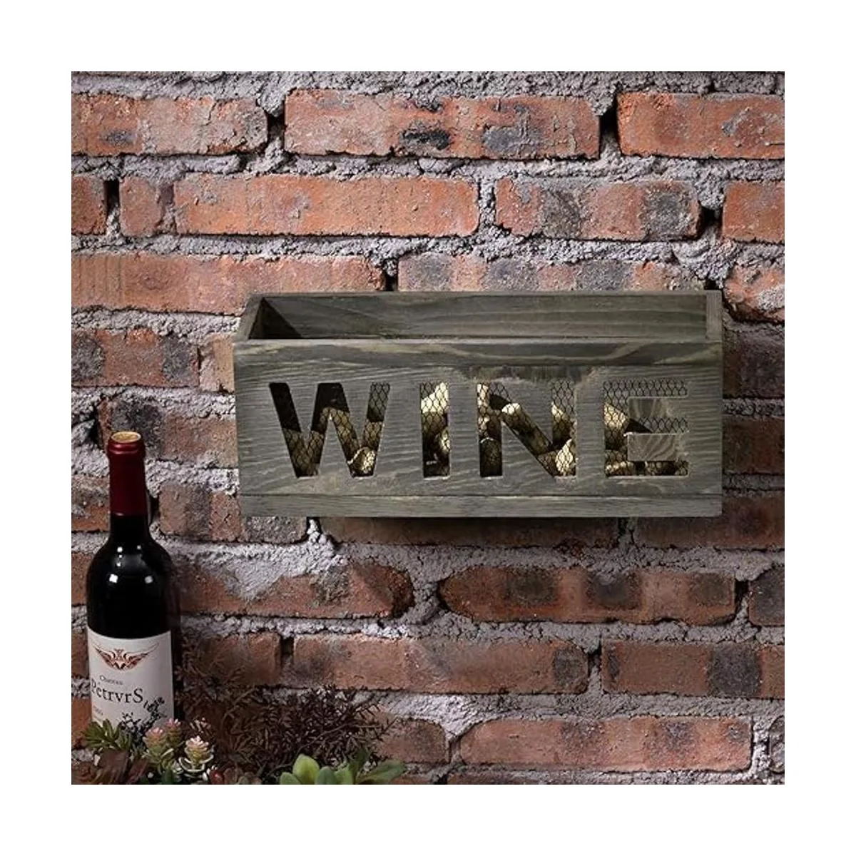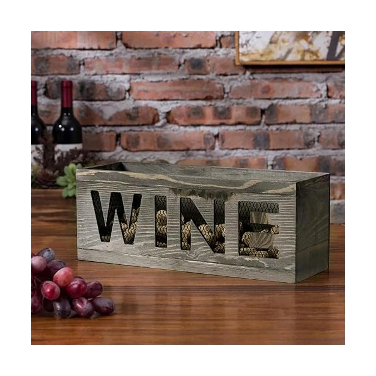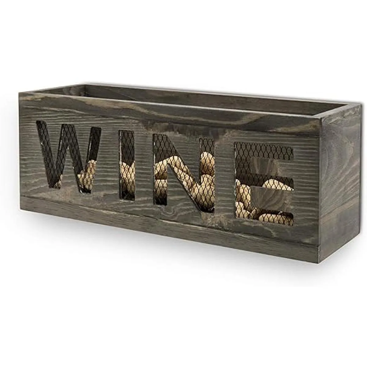 Cesta de corcho de vino montada en la pared con construcción de malla de metal y acabado de madera quemada gris, combina bien con decoraciones rústicas y de temática campestre