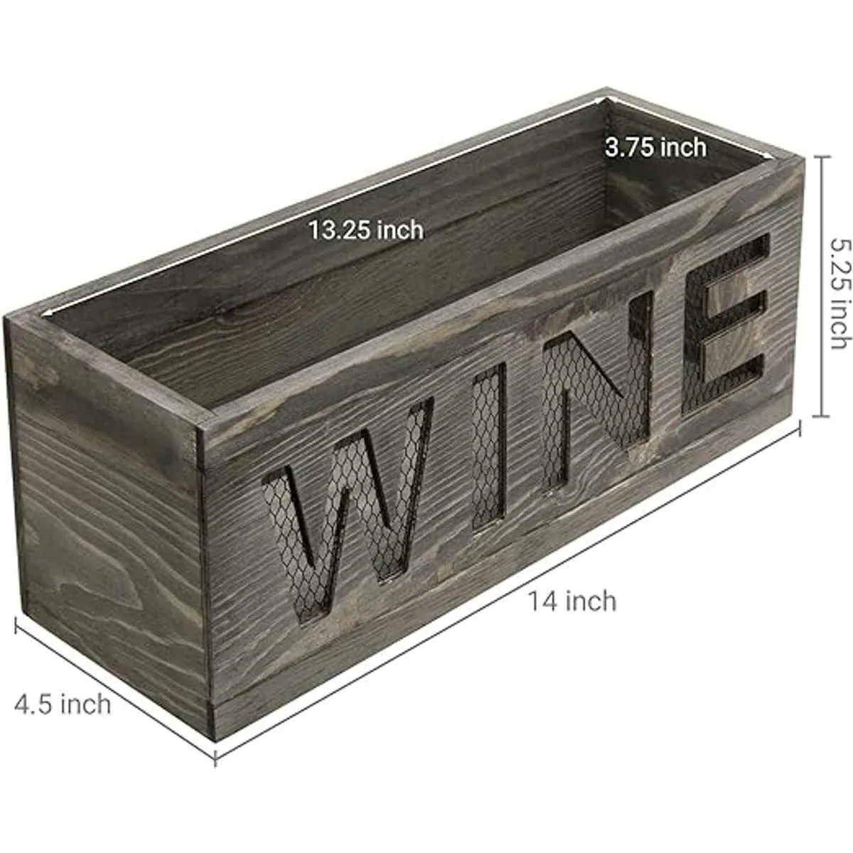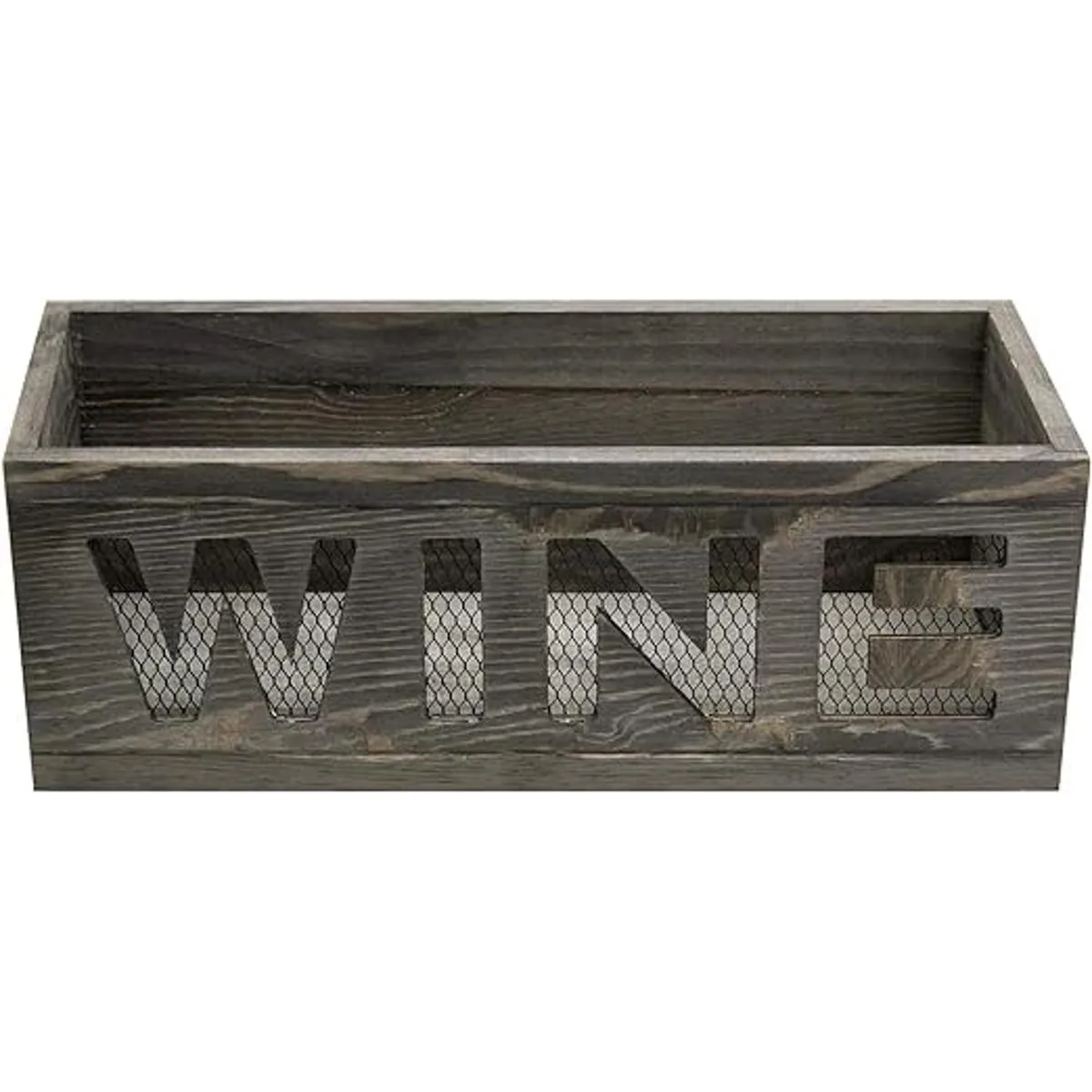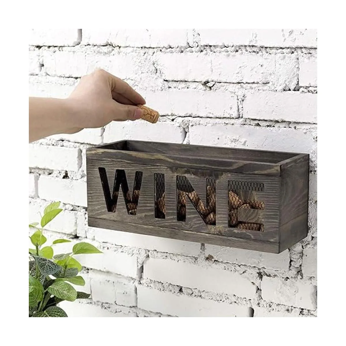 Cesta de corcho de vino montada en la pared con construcción de malla de metal y acabado de madera quemada gris, combina bien con decoraciones rústicas y de temática campestre