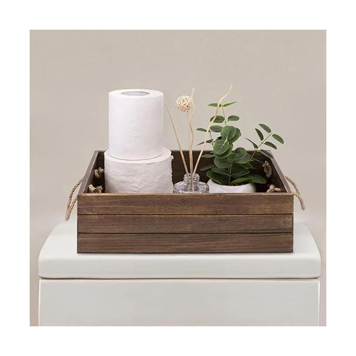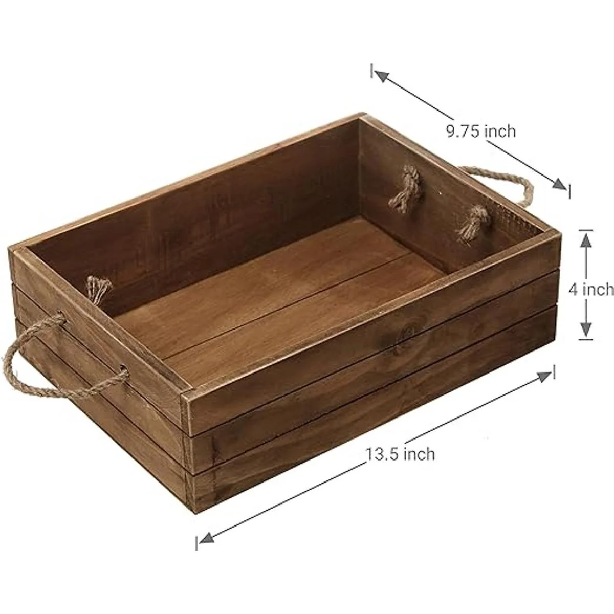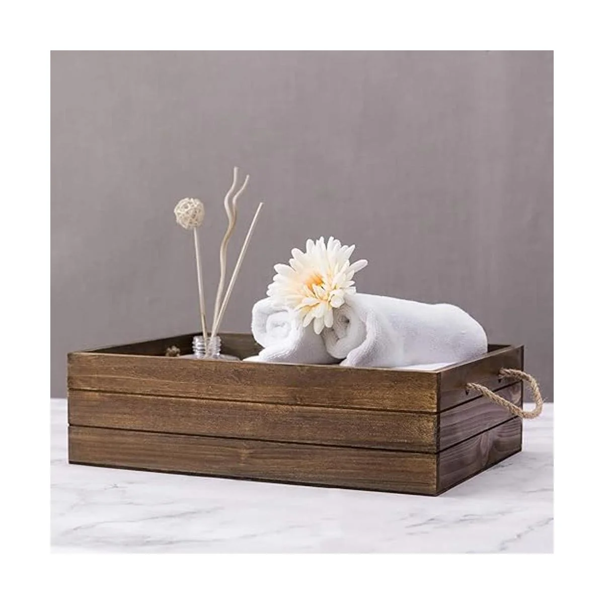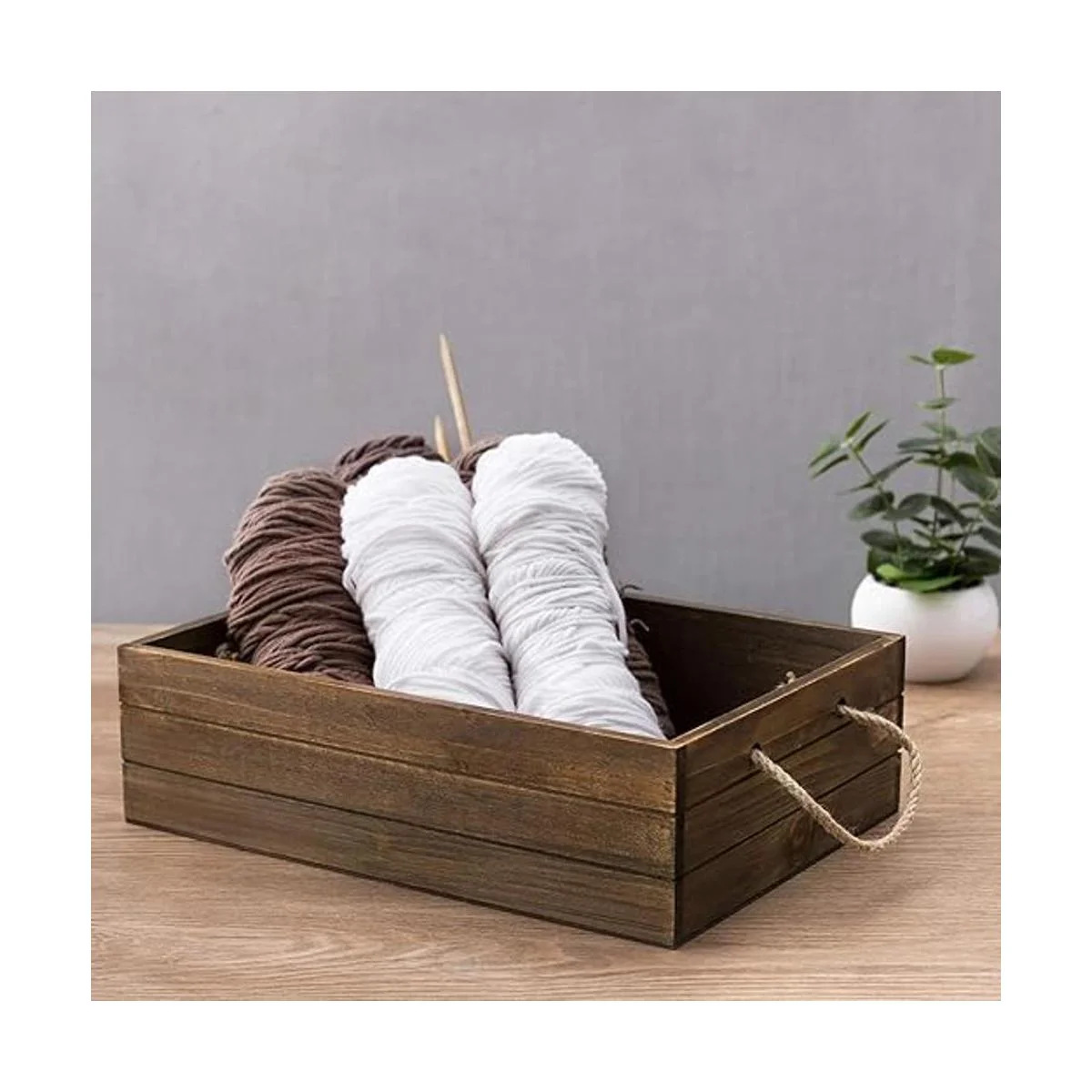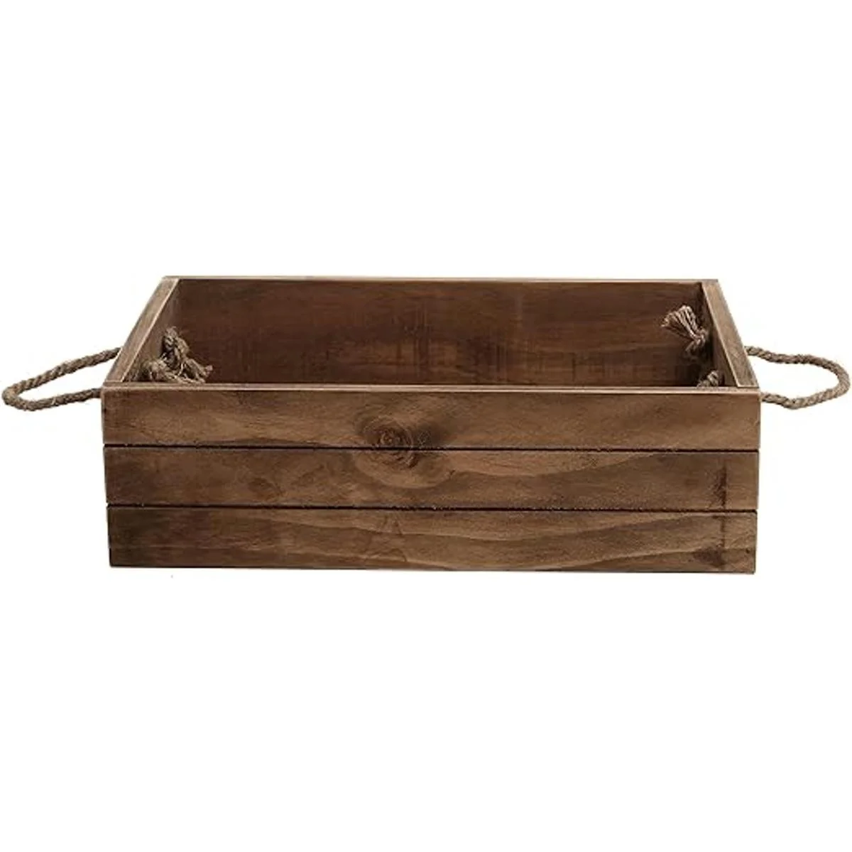 MyGift Cubo de almacenamiento de madera marrón rústico con asas de cuerda, caja de madera pequeña decorativa con tapa abierta