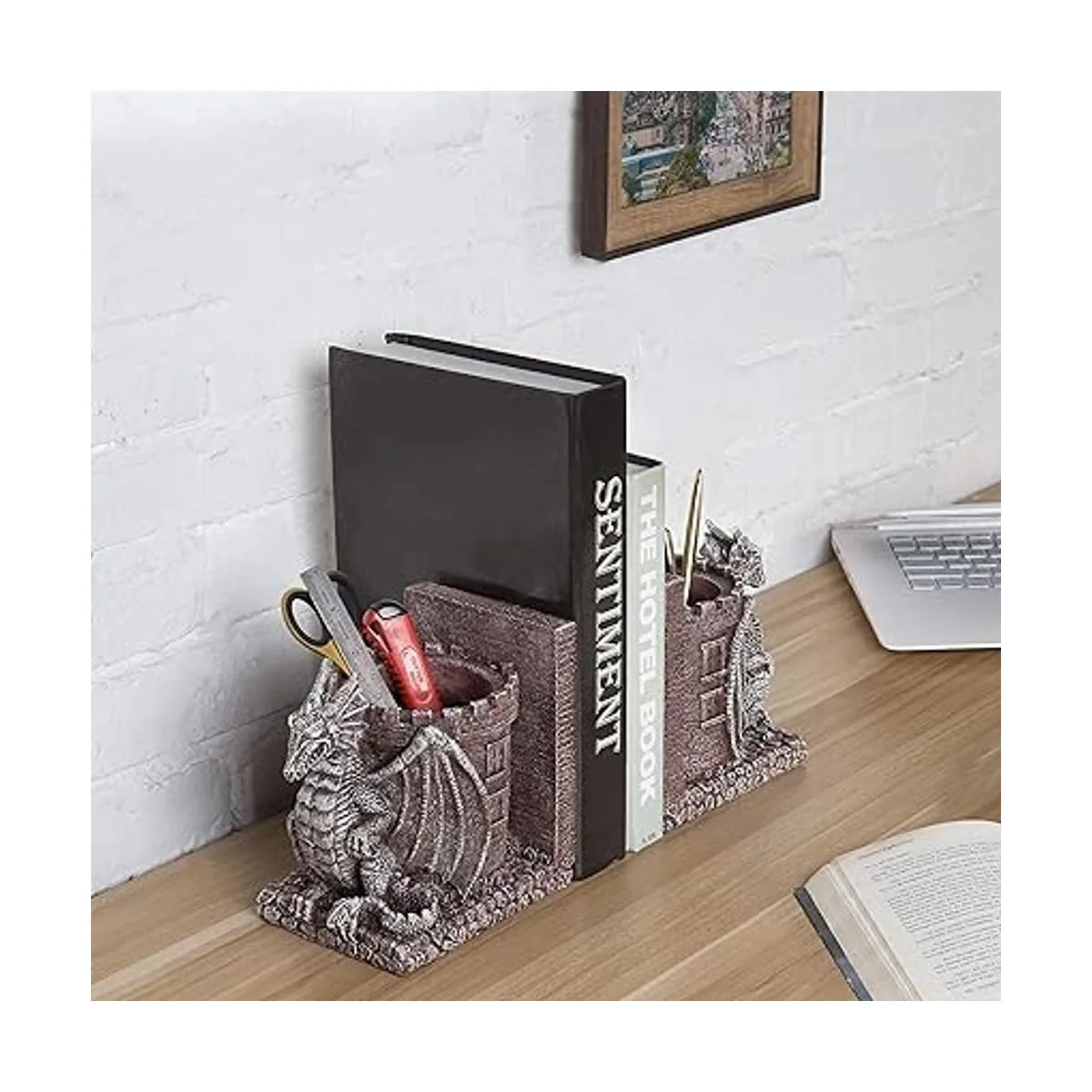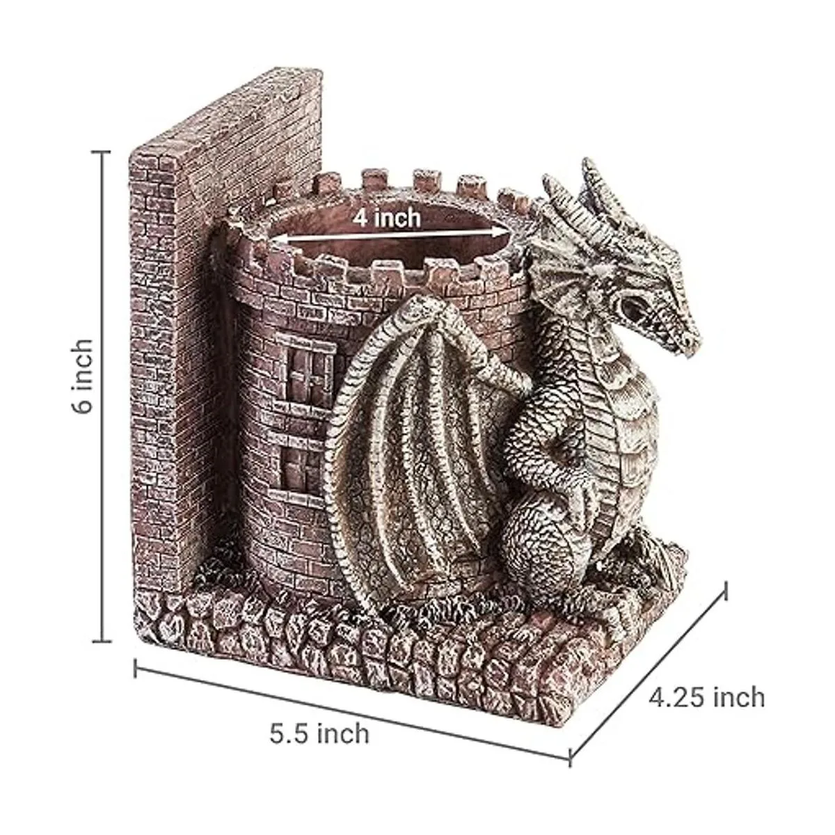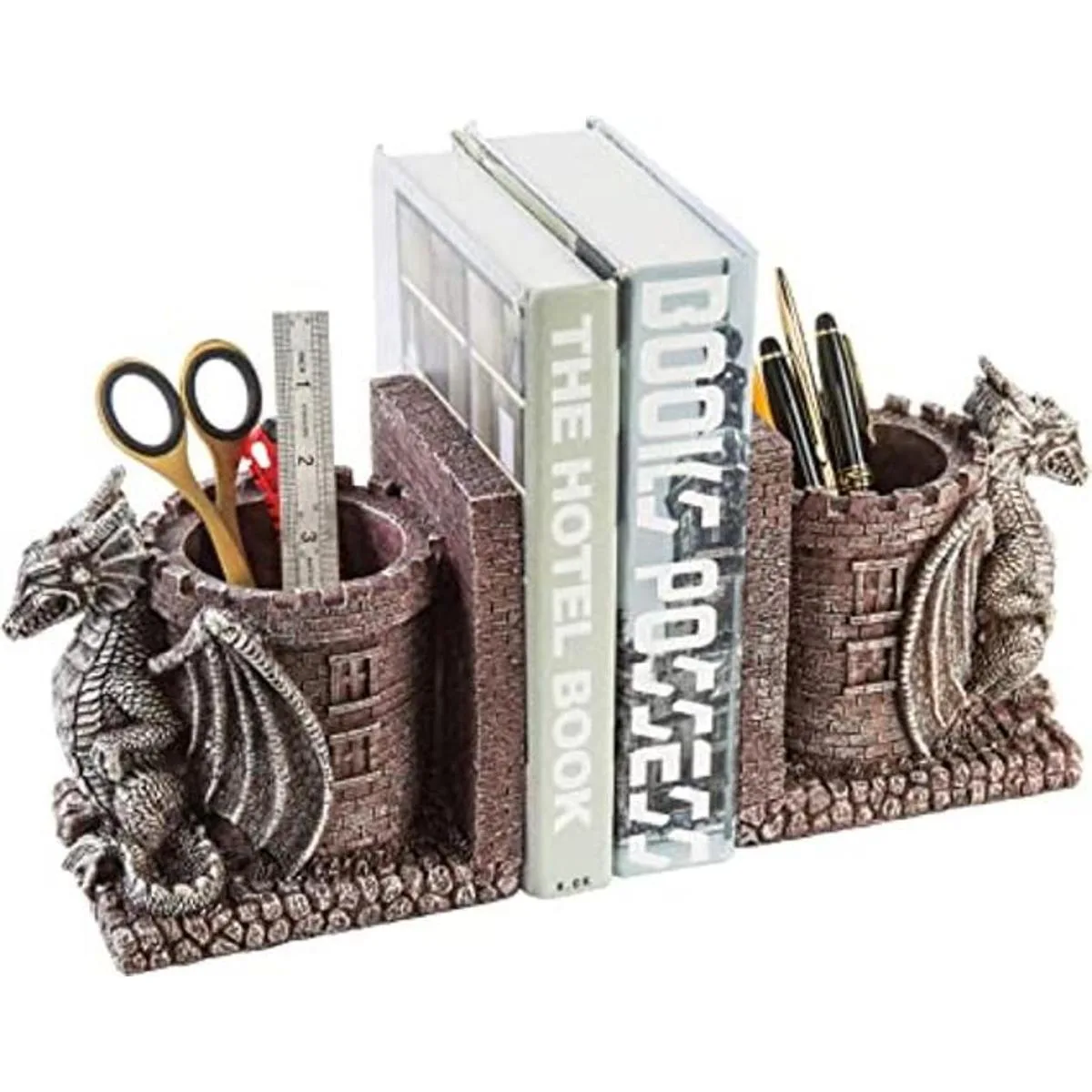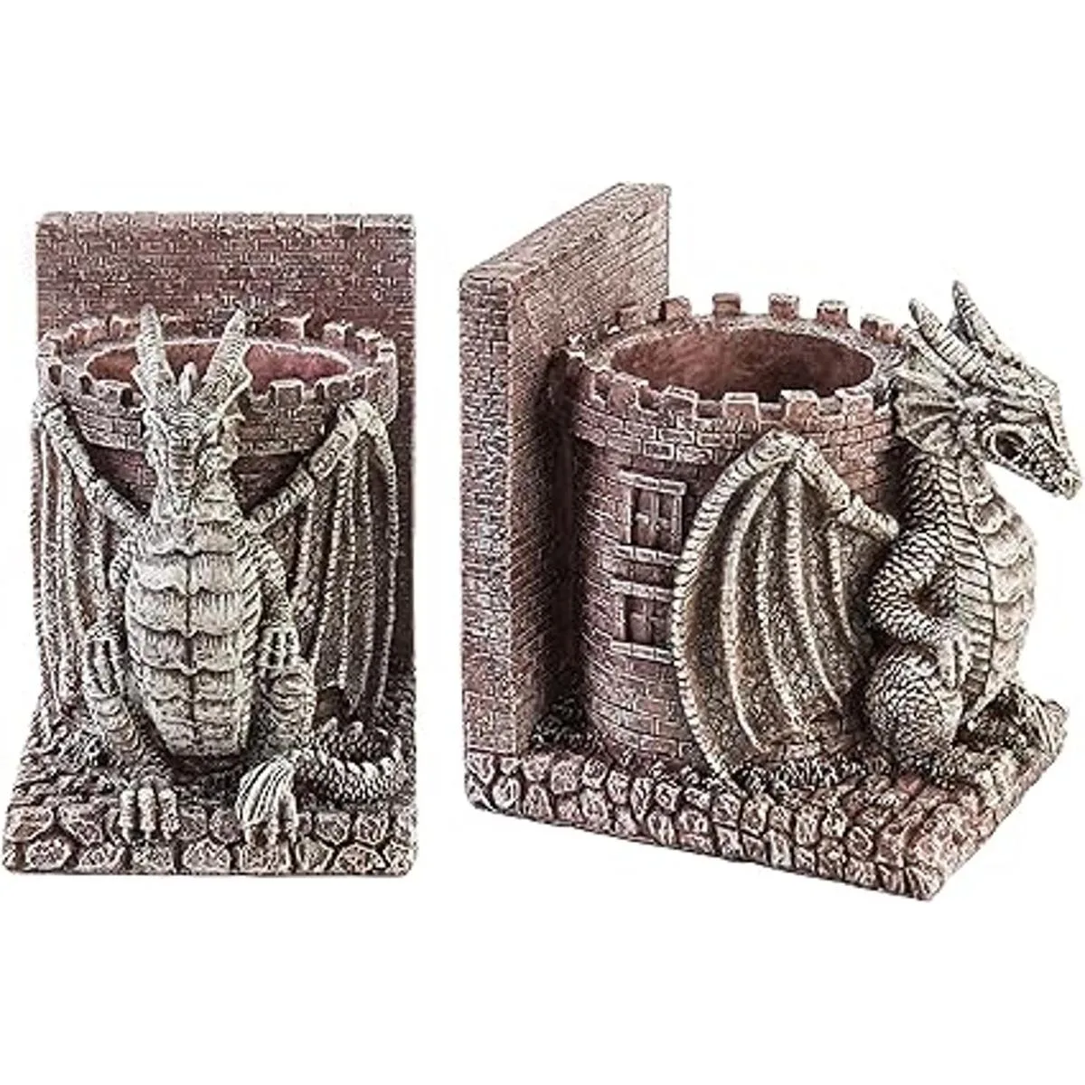 MyGift Sujetalibros decorativos de resina y soportes para lápices con diseño de castillo de protección de dragón