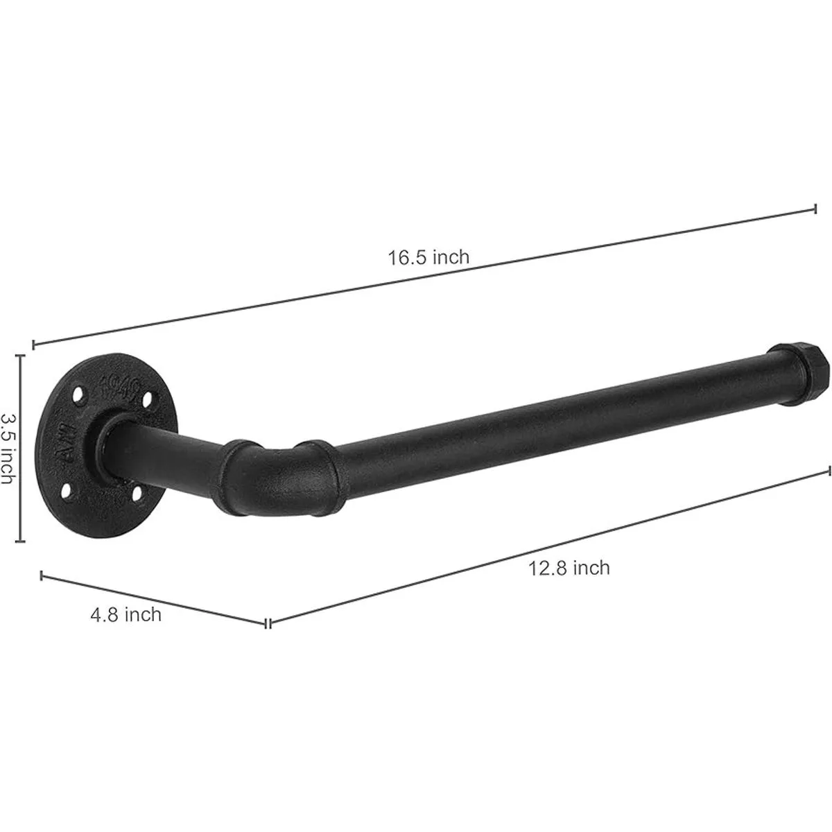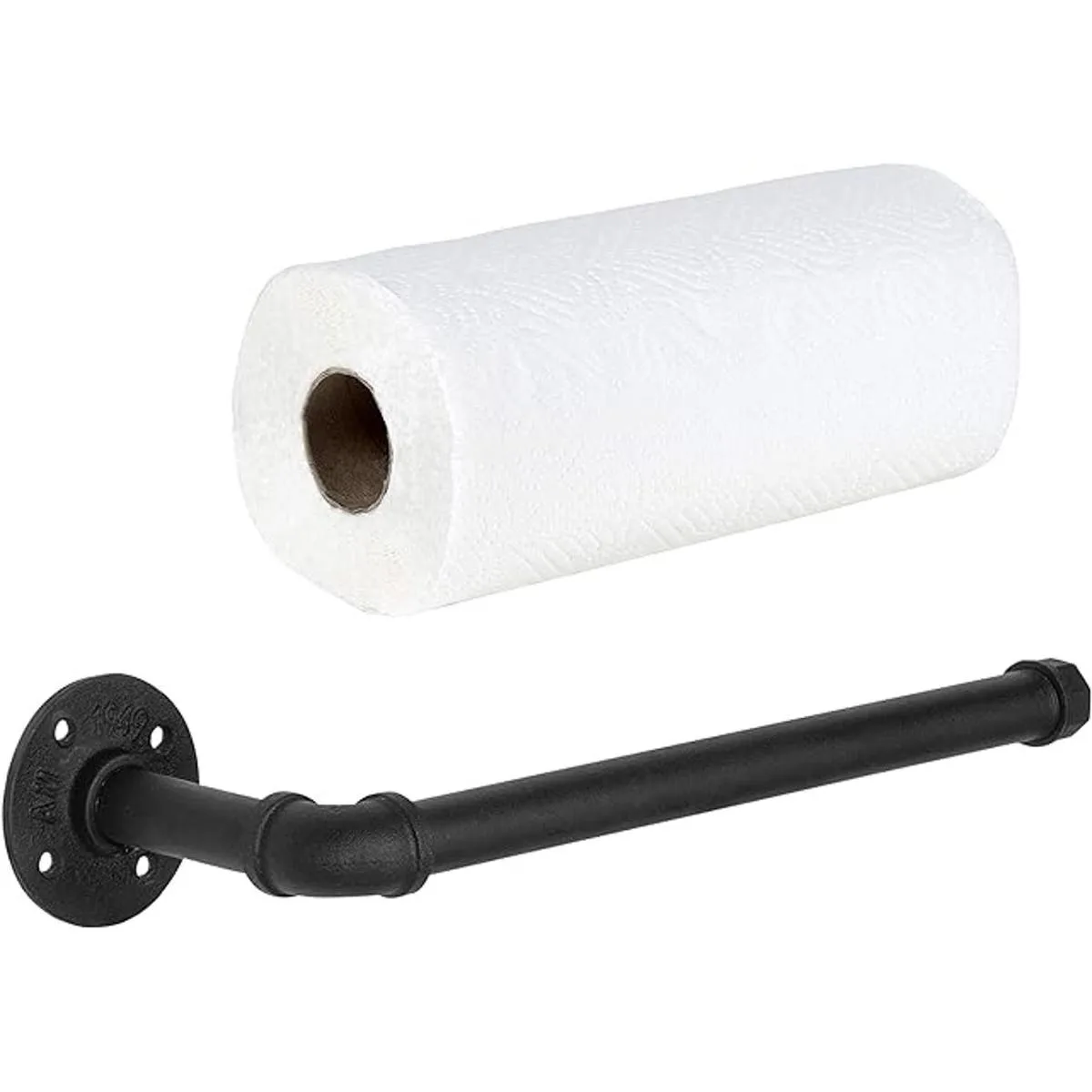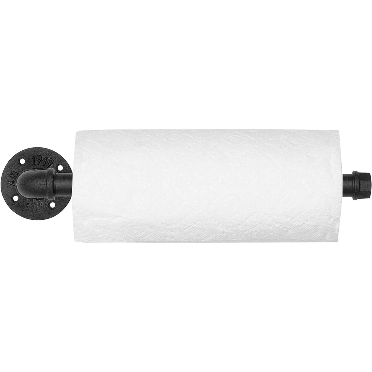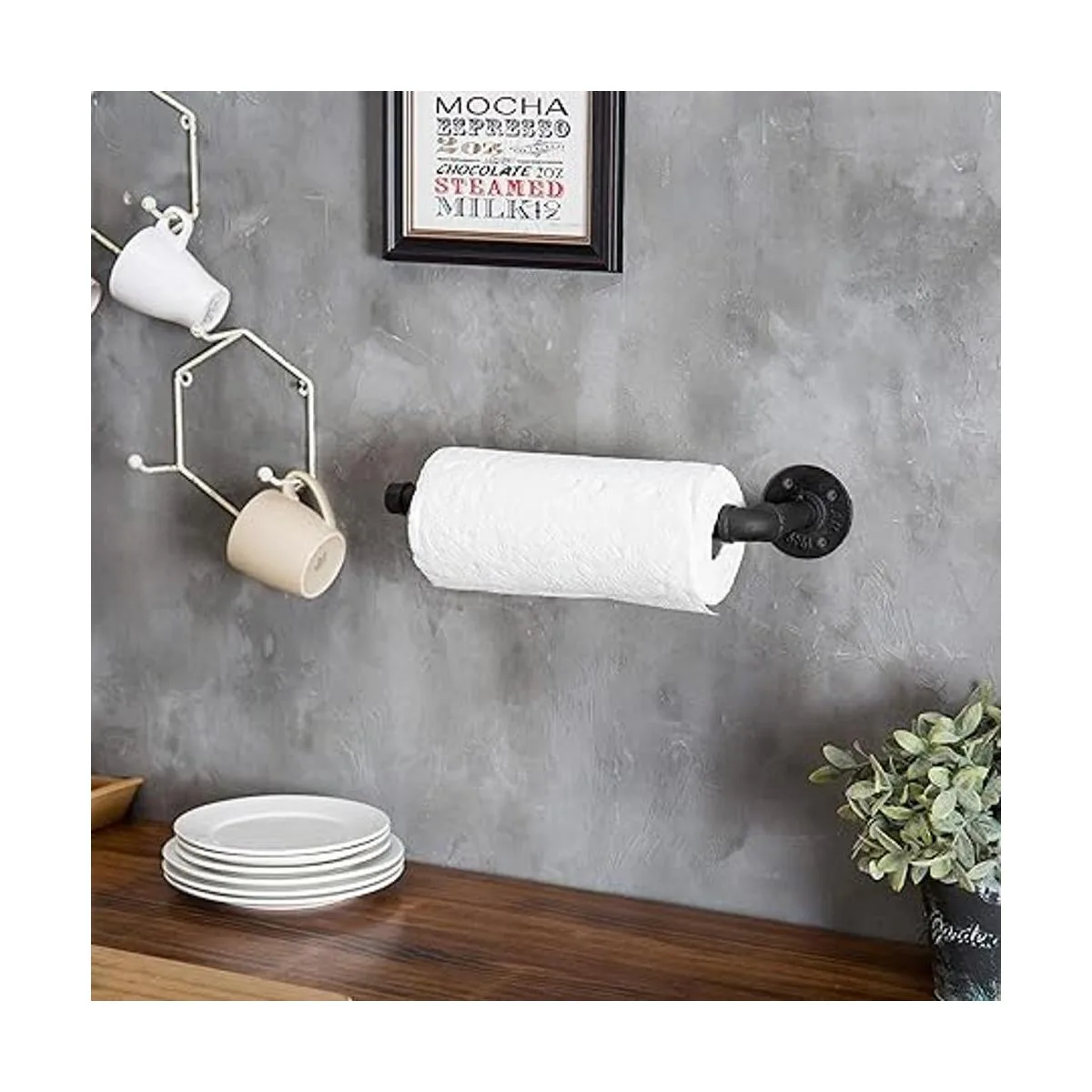Soportes de papel colgantes de inspiración industrial para pared o armario con acabado texturizado de pintura en polvo negro mate; los accesorios de tubería de aspecto realista complementan un estilo resistente y ecléctico y son el toque minimalista perfecto para un aspecto moderno de decoración industrial de cocina