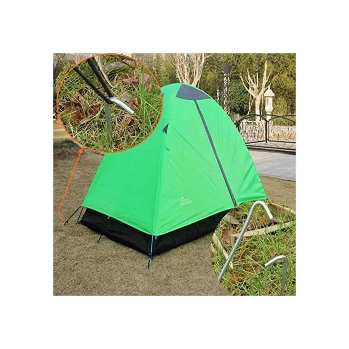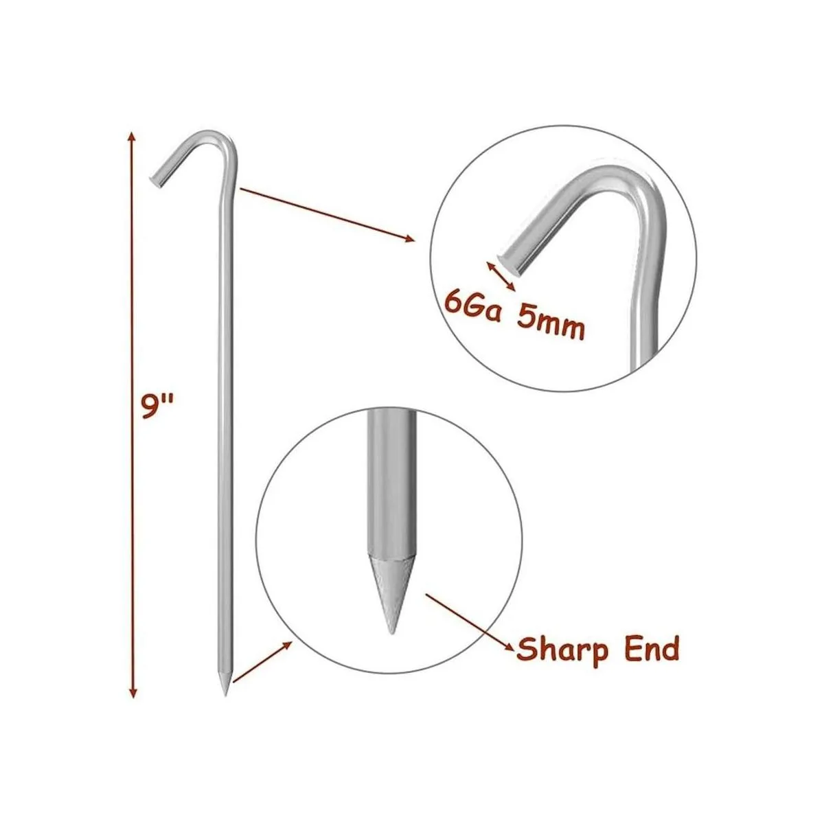 Longitud completa de 9 pulgadas con gran gancho antideslizante: 9 pulgadas de longitud y 0.197 in de diámetro galvanizado, no se oxida, con gancho antideslizante grande de 1 pulgada para garantizar que la estaca se pueda asegurar profundamente para una máxima robustez. Estas clavijas para tienda de campaña pueden penetrar y sujetarse firmemente en una amplia gama de condiciones del suelo. Ya no te molestará con una noche ventosa.