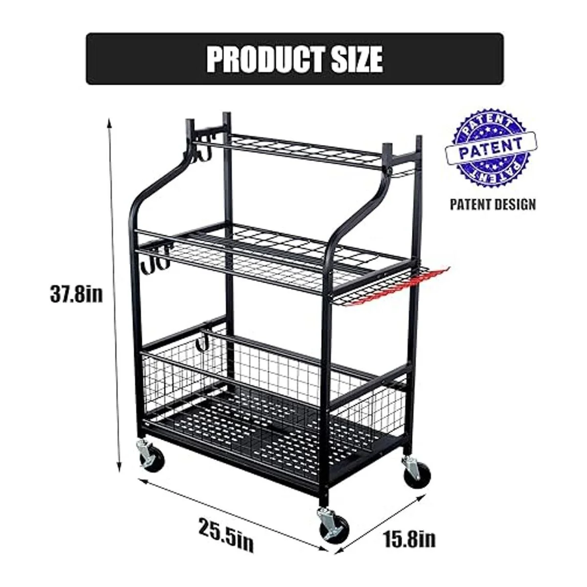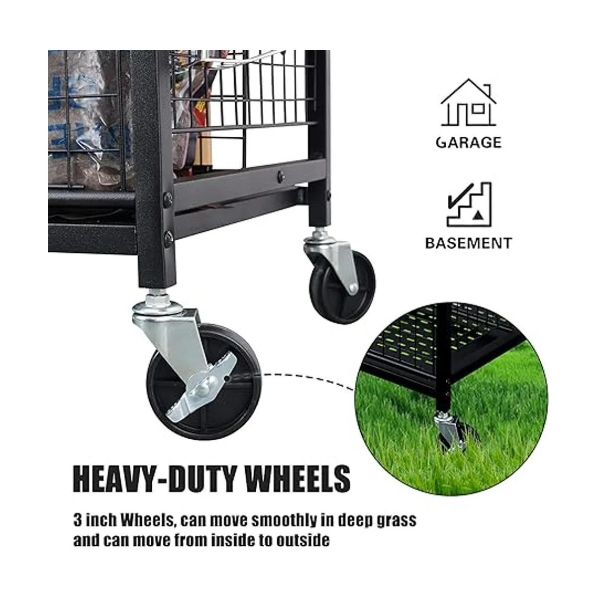 Diseño de rueda resistente: este organizador de herramientas de césped viene con ruedas resistentes que son de 3 pulgadas, se puede mover suavemente en césped profundo y se puede mover fácilmente de interior a exterior.