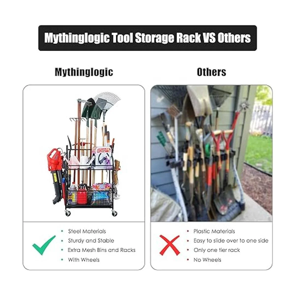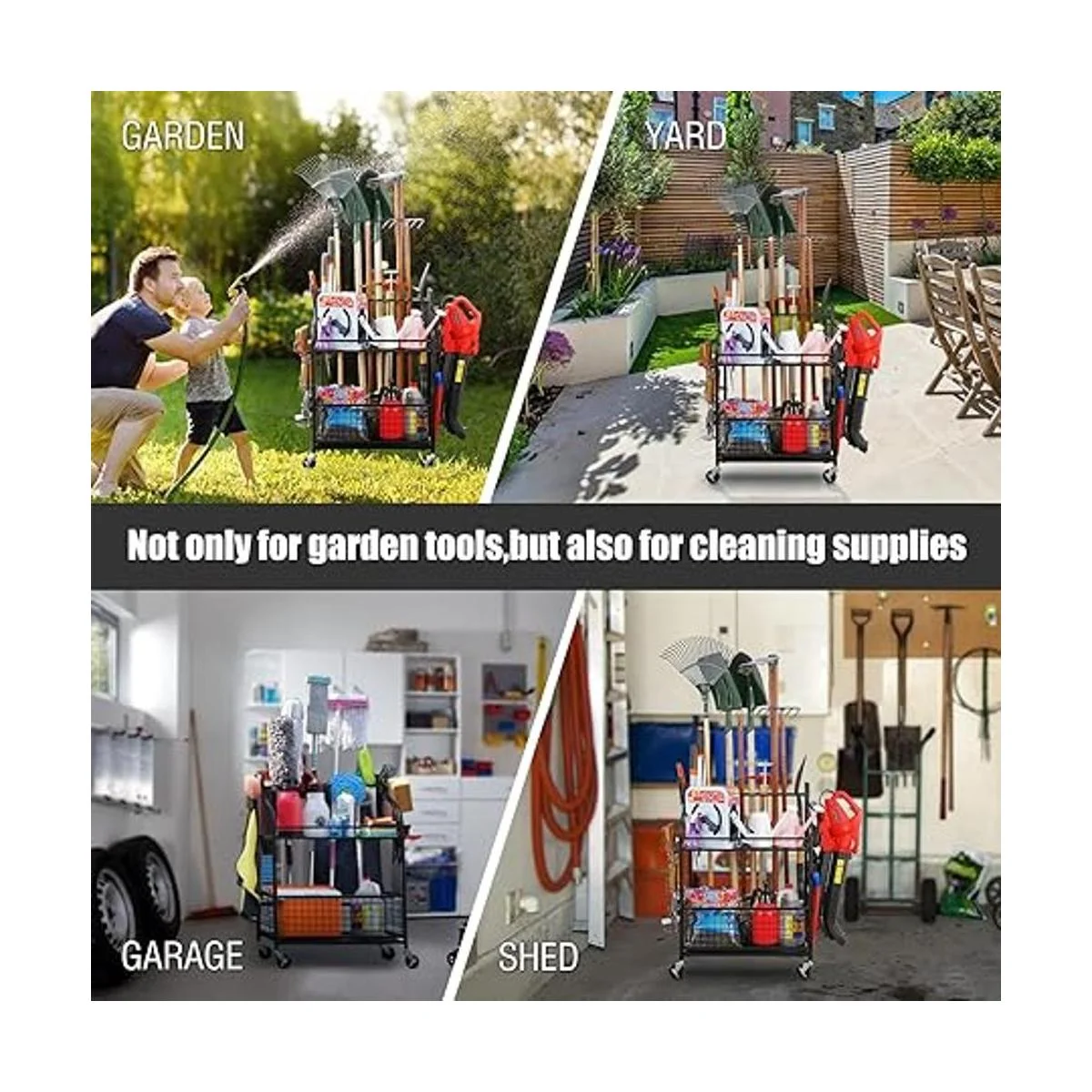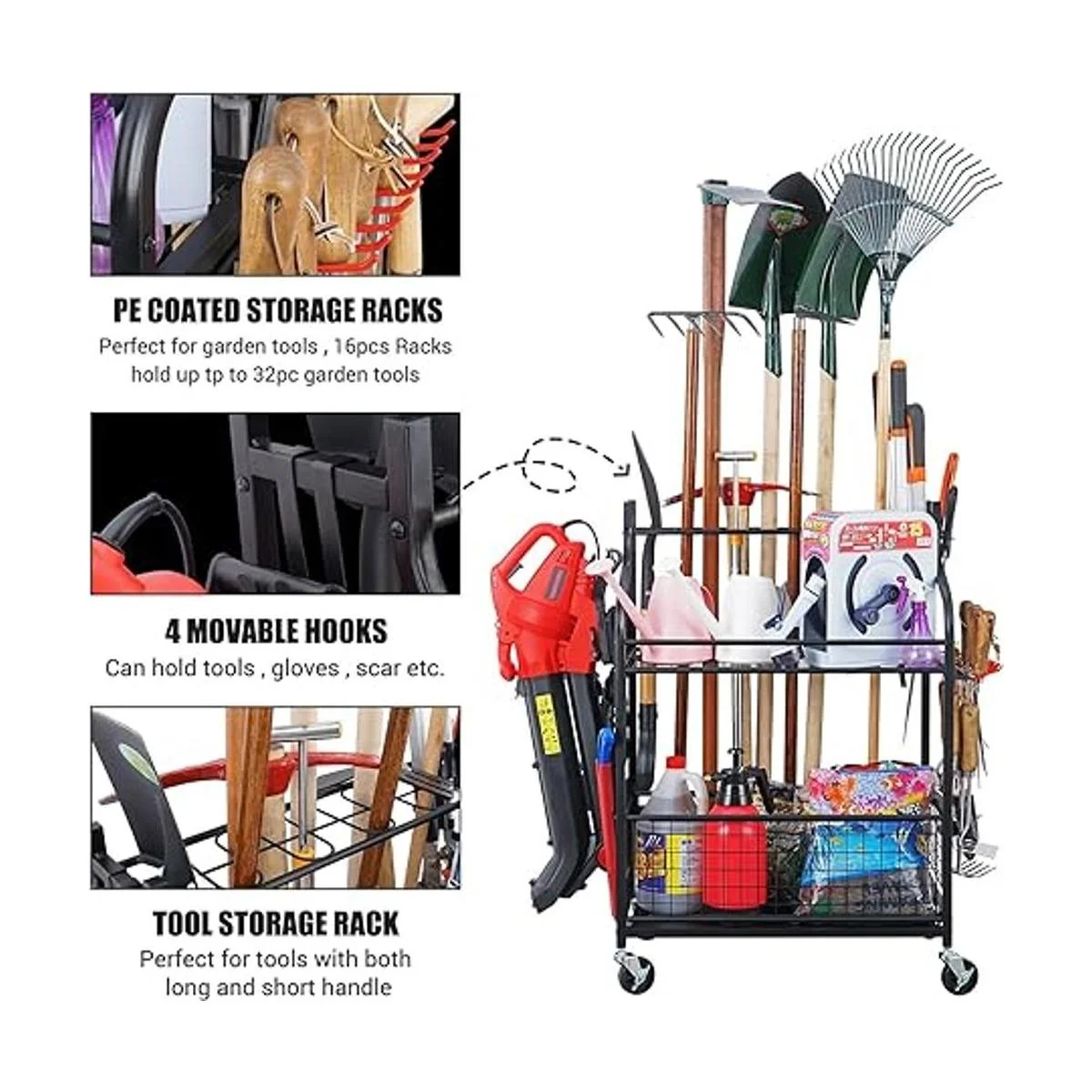 Mythinglogic Organizador de herramientas de jardín para portaherramientas de garaje y patio con ruedas, organizadores de garaje y almacenamiento para herramientas de jardín, soporte de herramientas de jardín para garajecobertizo, soporte de herramientas de jardín