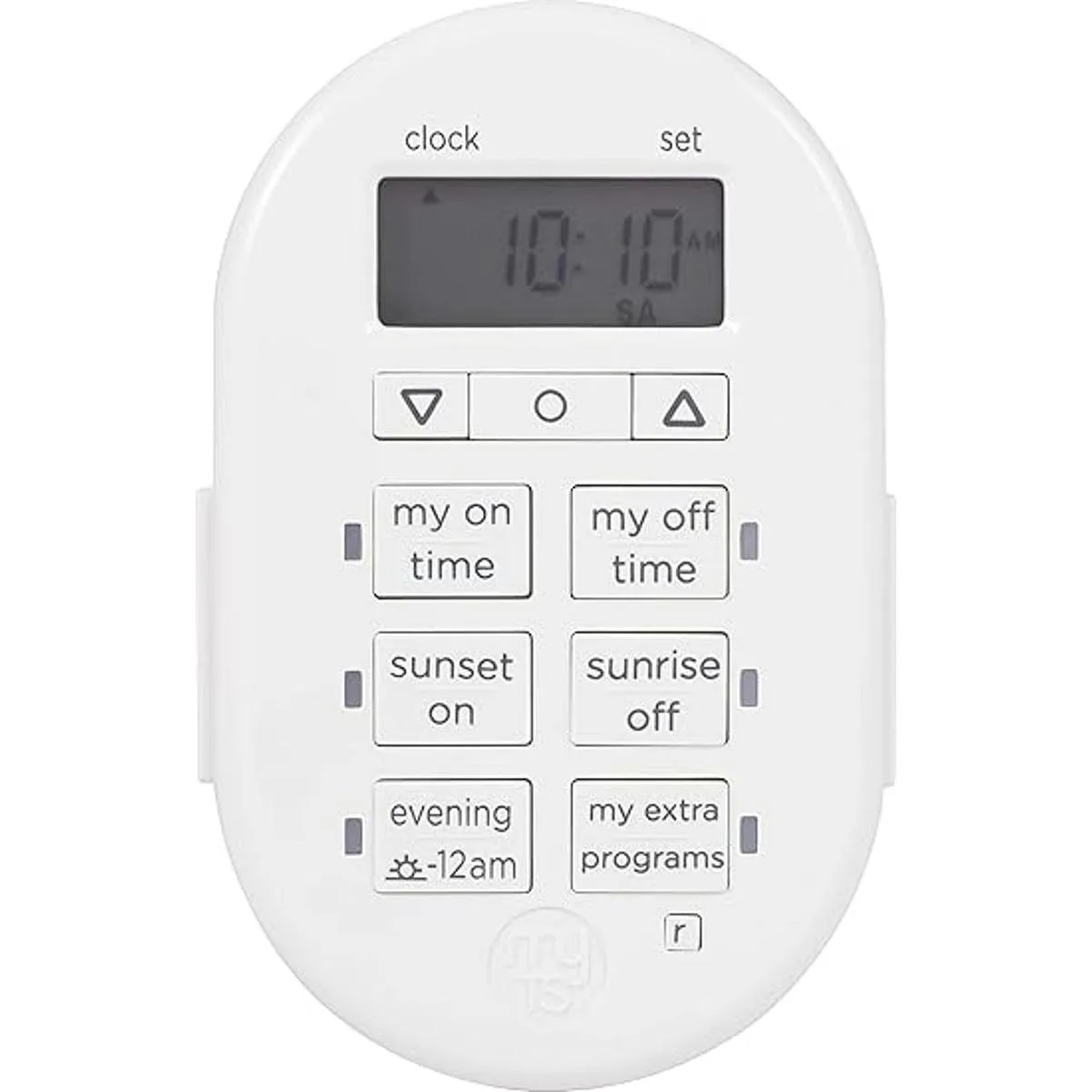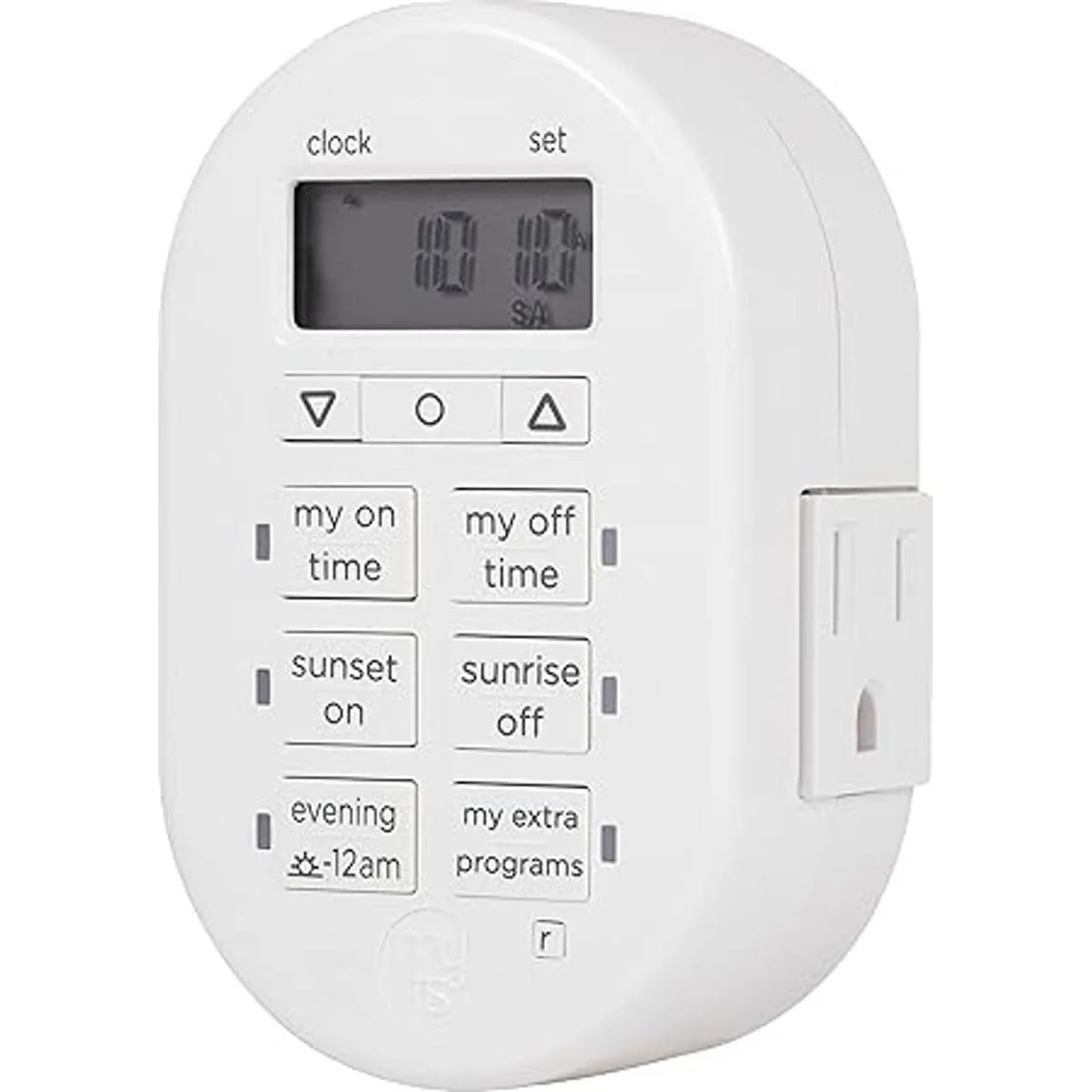 myTouchSmart Temporizador digital enchufable, interior, 7 días, 2 tomas de tierra, SunSmart, configuración simple, ideal para iluminación interior, lámparas, pequeños electrodomésticos, electrónica e iluminación estacional, blanco, 35150