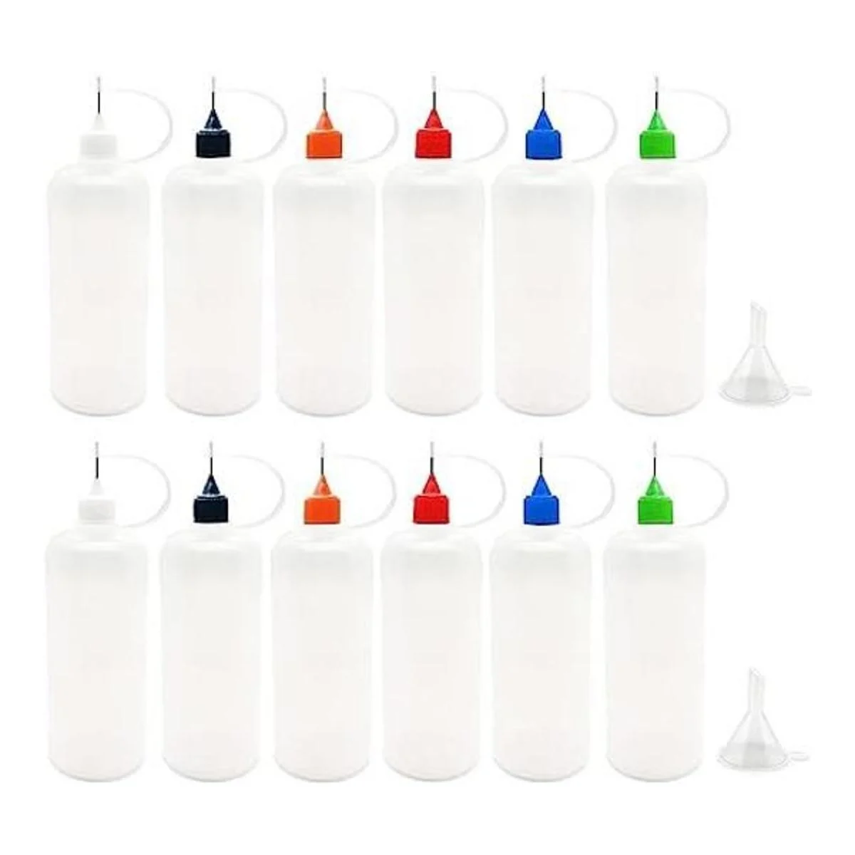 Juego económico: botella aplicadora de 12 puntas, 2 de cada color, 2 mini embudos.