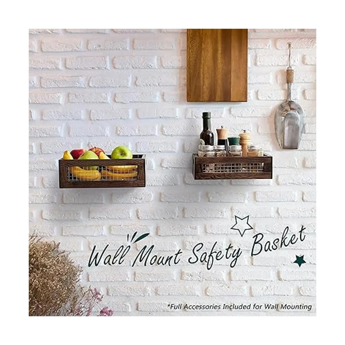 NAGAWOOD Juego de 2 cestas de madera para encimera para cocina, baño, despensa, montaje en pared con accesorios completos, organizador de almacenamiento de madera para frutas, verduras, productos, pan, espacio de almacenamiento con asas, madera rústica decorativa y alambre de metal