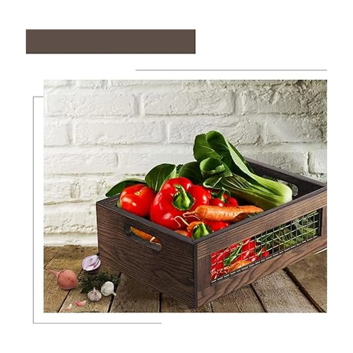 Frutas y verduras también: ya que la estructura cuenta con malla de alambre resistente en ambos lados, nuestras cajas de madera para encimera también pueden mantener frutas y verduras. El revestimiento de malla permite el flujo de aire y la transpirabilidad, por lo que tus frutas permanecen frescas.