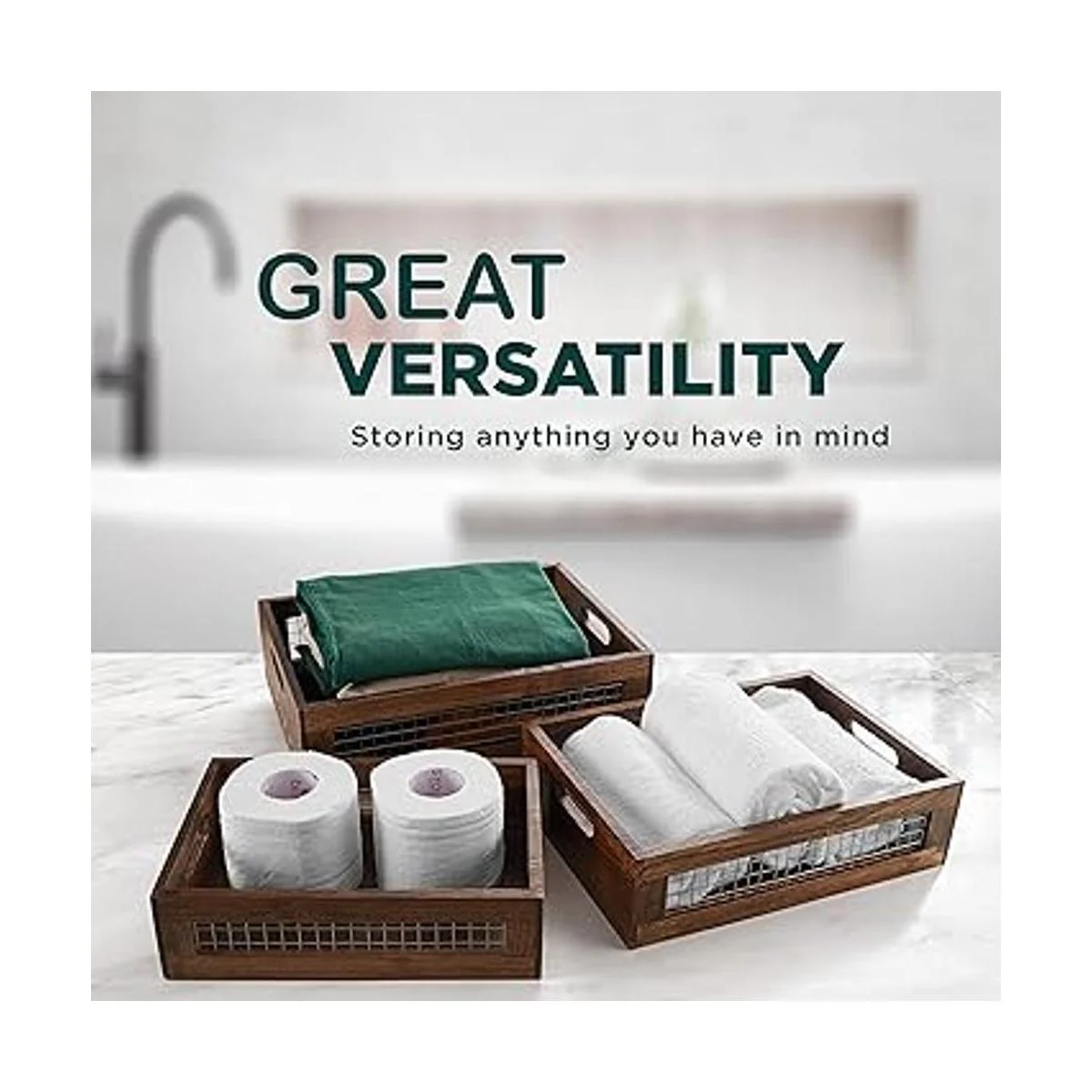 NAGAWOOD Juego de 3 cestas de madera para encimera para cocina, baño, despensa, organizador de almacenamiento de madera para frutas, verduras, productos, pan, caja de madera con asas, madera de nogal decorativa y alambre de metal