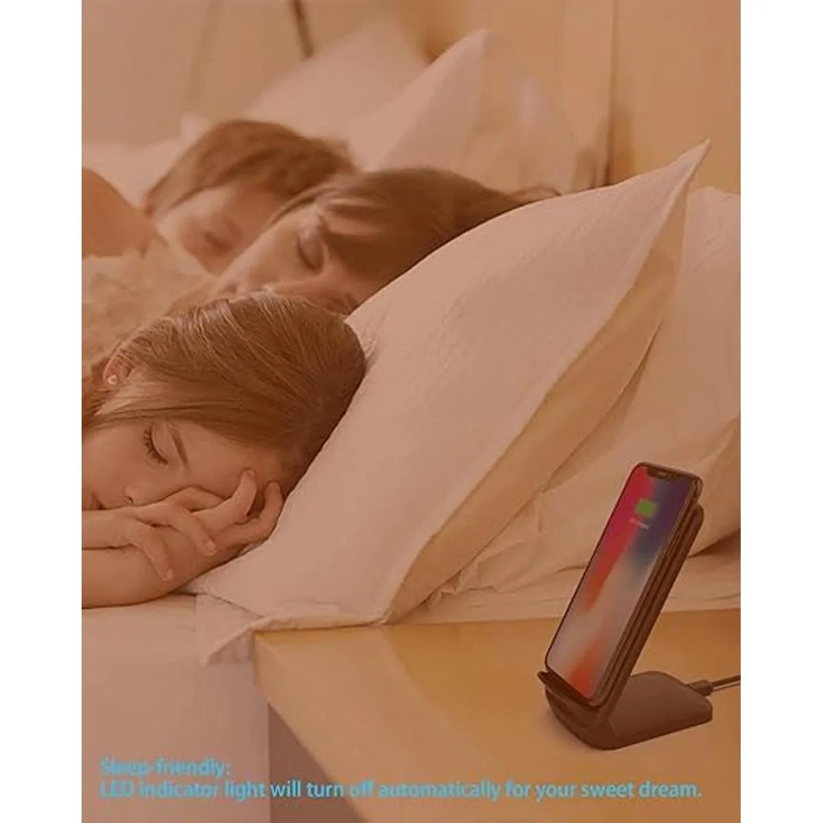 Práctica carga inalámbrica QI: di adiós a los cables enredados y disfruta de la carga inalámbrica simplemente colocando tu teléfono en el soporte de carga, no más problemas de enchufe/salida. Sin sonidos de pitido y luces molestas con este cargador inalámbrico rápido mejorado, su indicador LED se apagará automáticamente después de 10 segundos para tu dulce sueño.