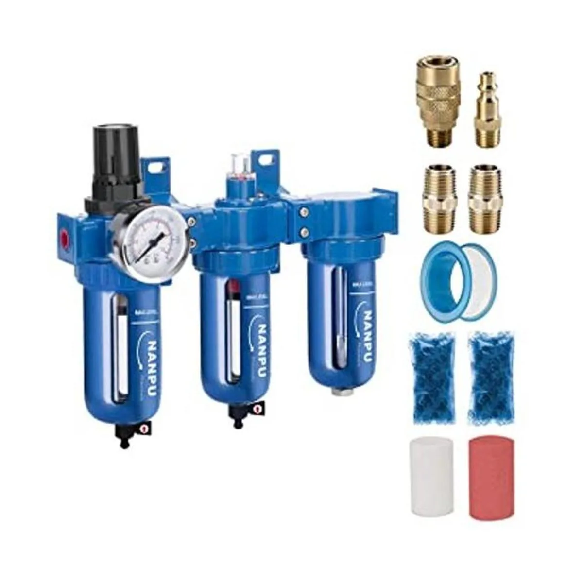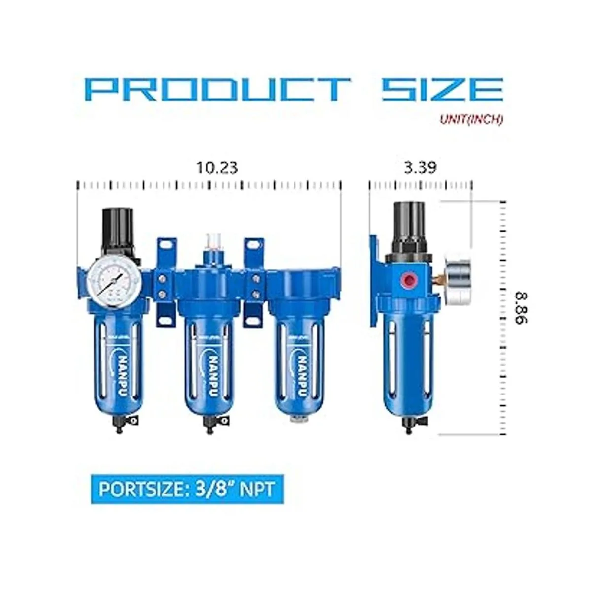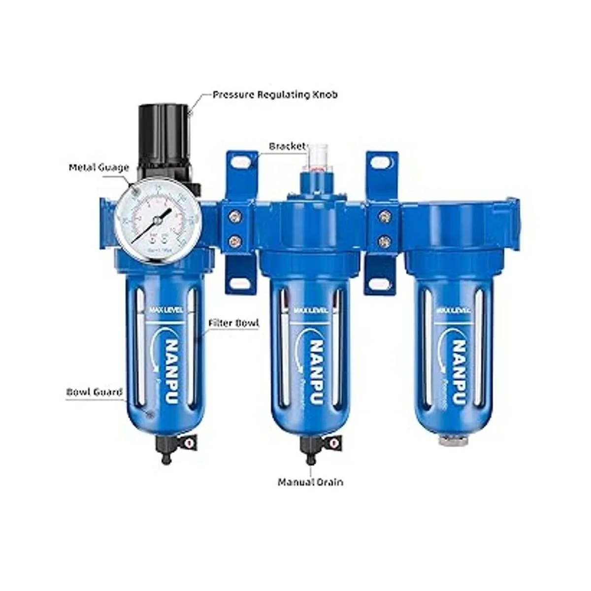 NANPU Sistema de aire de aleación de zinc de 3 etapas filtro de partículas, filtro coalescente, secador desecante y regulador de aire, cuenco de polietileno, drenaje manual, flujo medio, adecuado para pintura en aerosol y cortador de plasma NPT de 38 pulgadas