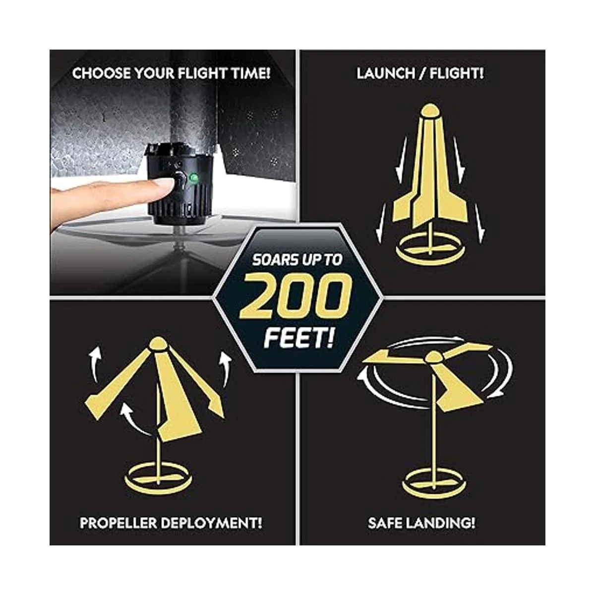 Lleva la diversión al aire libre a nuevas alturas: nuestro juguete de cohete recargable, motorizado, pendiente de patente se eleva hasta 200 pies con hasta 20 vuelos con una sola carga.