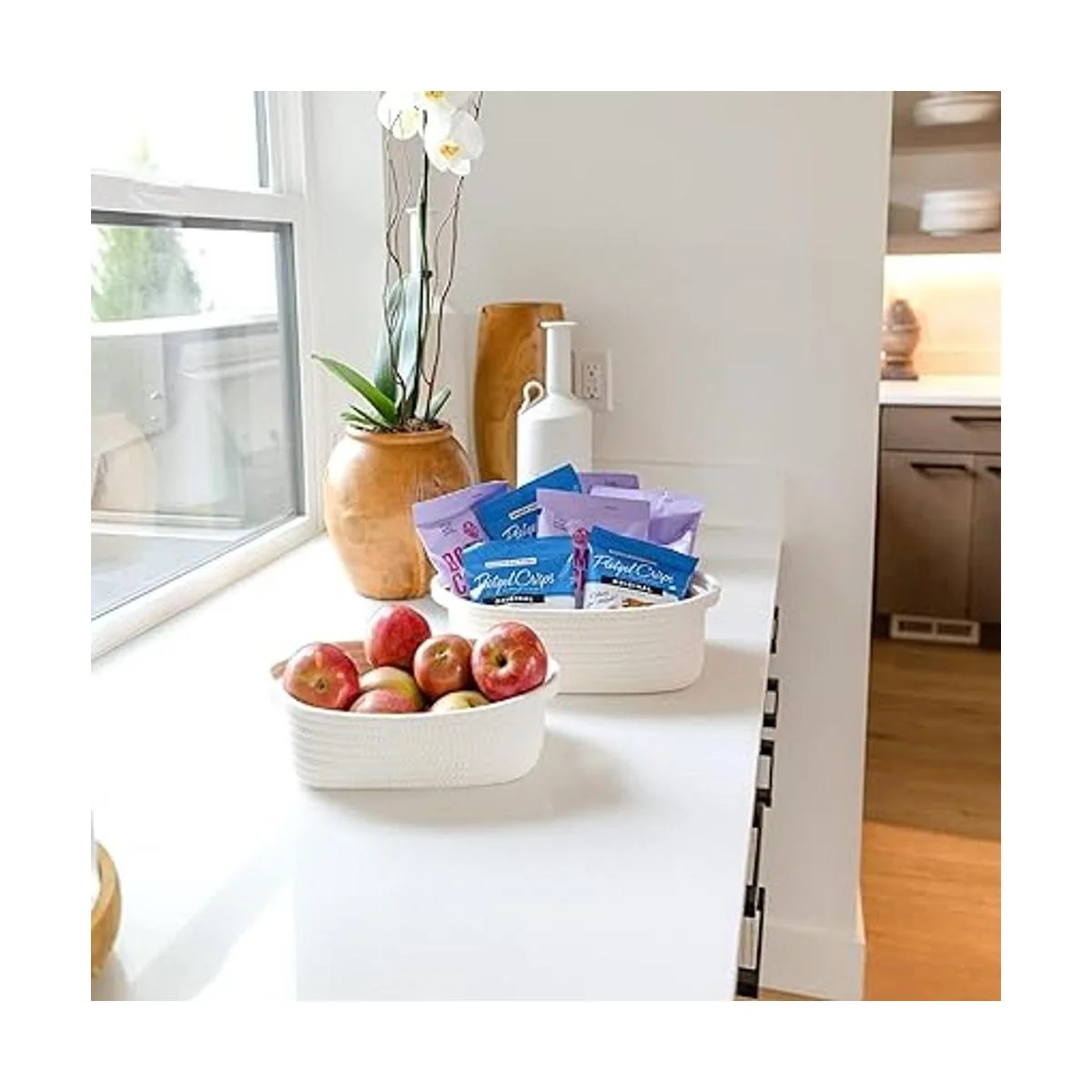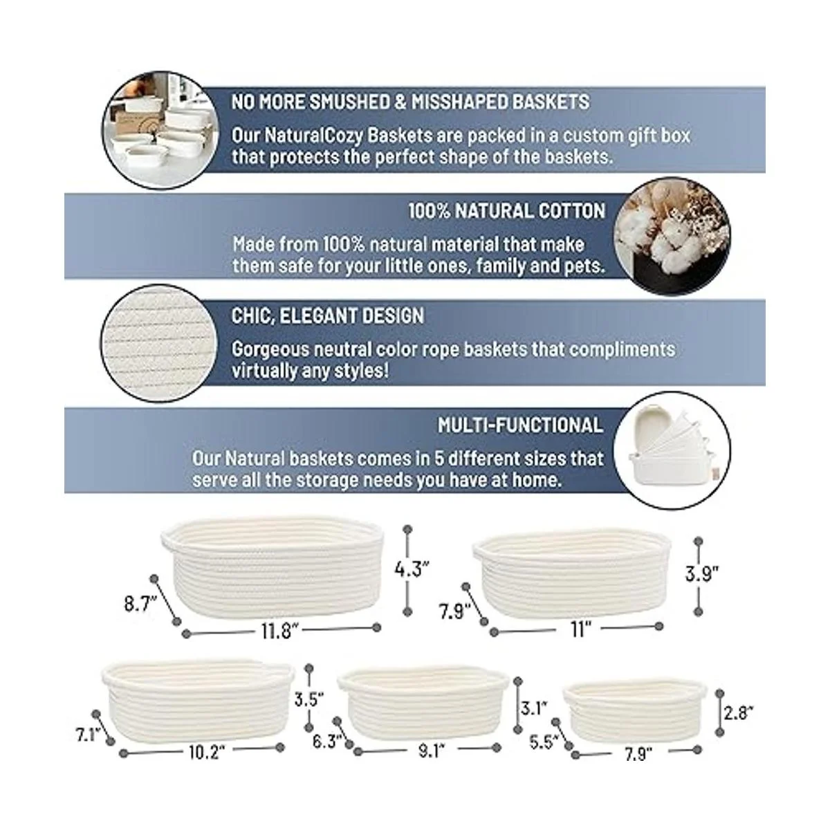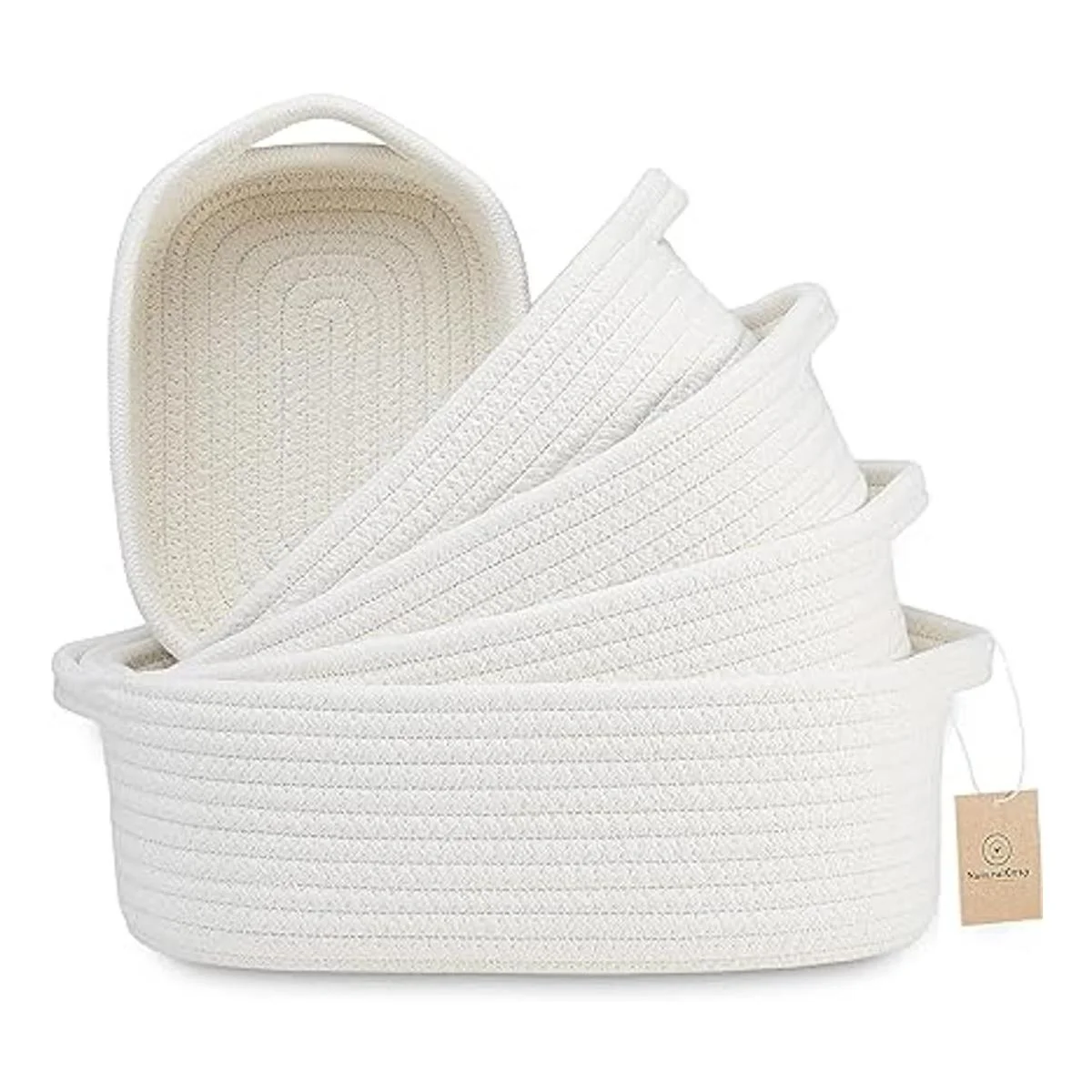 NaturalCozy Juego de 5 cestas de almacenamiento rectangulares de cuerda de algodón natural para organizar. Cesta pequeña para Montessori, guardería de bebé, cestas de juguetes para perros, caja de juguetes para gatos, organizador de baño