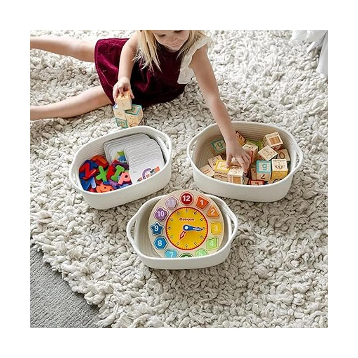Hecho de algodón natural seguro: Nom, Nom, Nom, Nom. Cuando estás renovando el cuarto de bebé con una cesta de juguetes muy elegante, tu pequeño está destinado a convertir las asas de la cesta en sus propios mordedores personales. No te preocupes, mamá. Nuestras cestas tejidas para almacenamiento están hechas de 100 algodón natural, por lo que son completamente seguras para las bocas y las manos pequeñas. Sin productos químicos ni ingredientes tóxicos. Además, no encontrarás una sola piel sintética en ningún lugar que pueda ser perjudicial para tu pequeño o tu mascota.