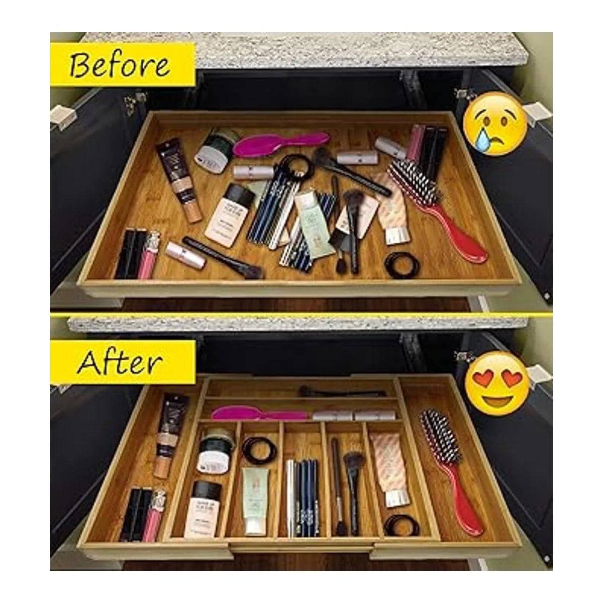 Organiza cualquier cajón en cuestión de segundos Nuestro organizador de bambú ajustable se expande para adaptarse a cualquier cajón y tiene 9 compartimentos separados, por lo que es perfecto para organizar cosas en cualquier habitación de tu hogar. Encuentra fácilmente cubiertos de cocina, accesorios y los cubiertos que necesitas para esa comida perfecta. Mantén las pestañas en bolígrafos, lápices, suministros de manualidades y arte para que puedas pasar más tiempo siendo creativo y menos tiempo buscando el pincel del tamaño adecuado.