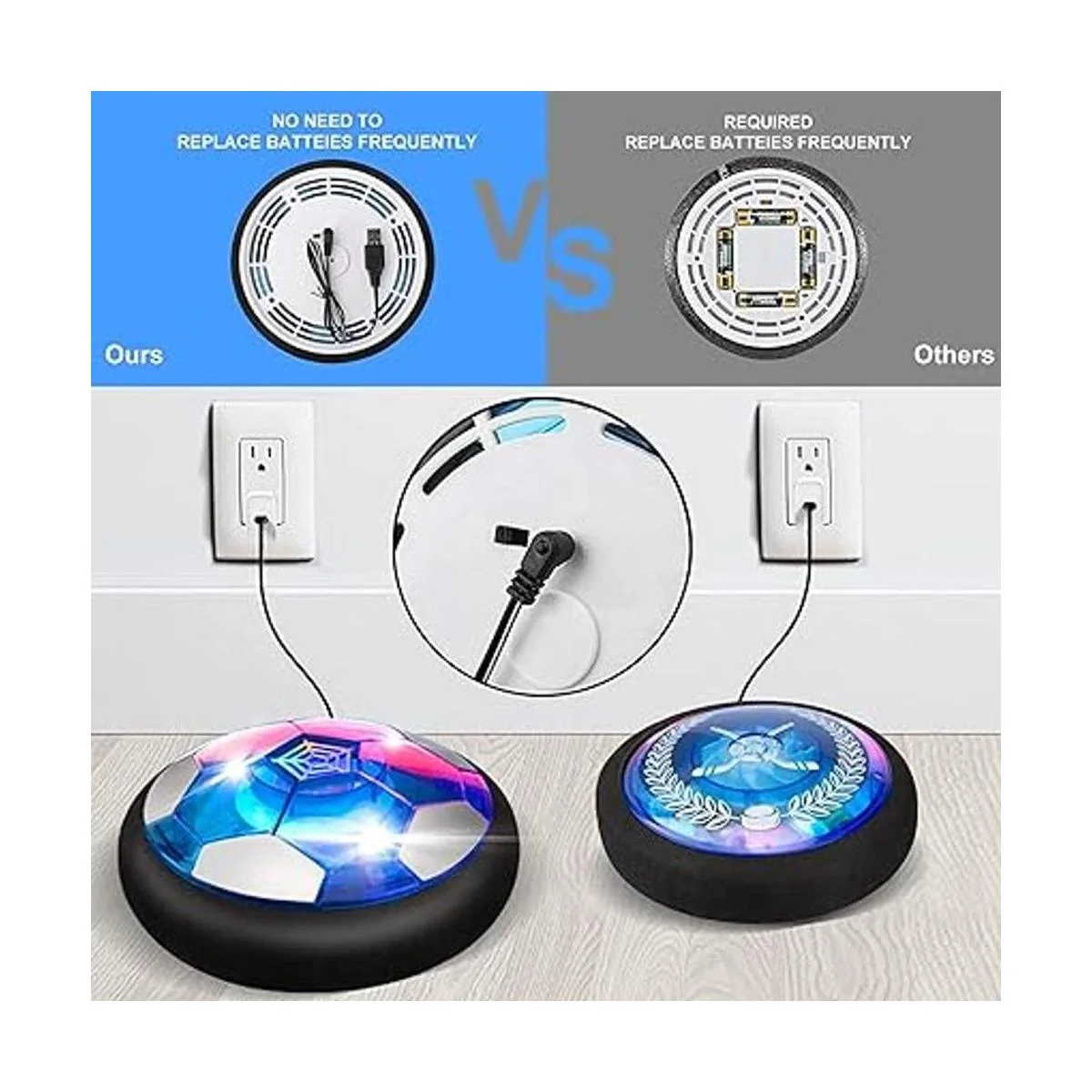 Juego de fútbol de hockey 3 en 1: incluye 1 hockey recargable, 1 pelota de fútbol recargable, 2 porterías, 1 fútbol inflable, 2 palos de hockey y 1 cable de carga. Las dos bolas son alimentadas por una batería recargable de iones de litio de 350 mAh. Debido al largo transporte marítimo, el hockey flotante puede quedarse sin batería cuando llegue, en ese momento debe cargarse completamente para funcionar.