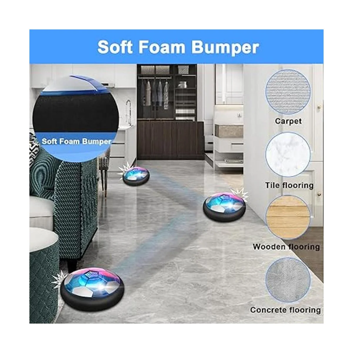 Parachoques de espuma suave de seguridad : el juego de fútbol de hockey está hecho de materiales no tóxicos y seguros, sin olor, no se decolora y no daña a los niños El borde de la bola flotante está equipado con una capa amortiguadora de espuma y almohadillas de espuma suave en el borde, que pueden proteger la seguridad de los niños y tus paredes o muebles de golpes, arañazos o marcas. Es muy adecuado para niños o mascotas para jugar.