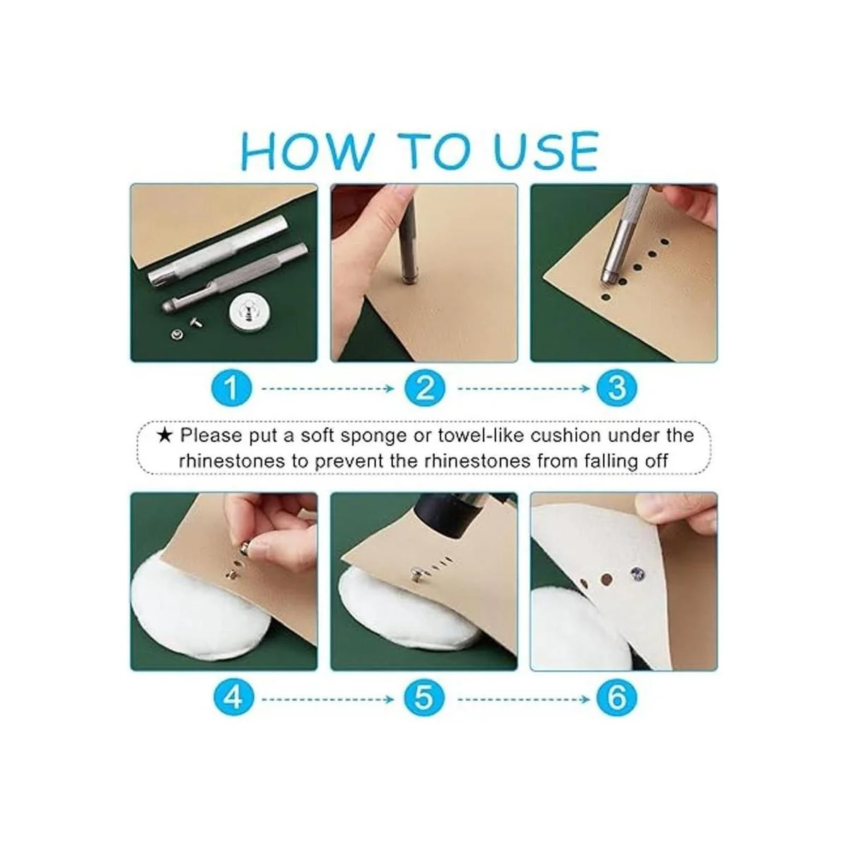 El paquete incluye: 200 remaches, 1 juego de herramientas de instalación de ojales de acero, 1 juego de herramientas de cuero, 1 contenedor de almacenamiento de cuentas de plástico cuadradas. Se puede utilizar y fijar fácilmente con herramientas y se ajusta de forma segura a tu tela, cinturones o cualquier producto de decoración.