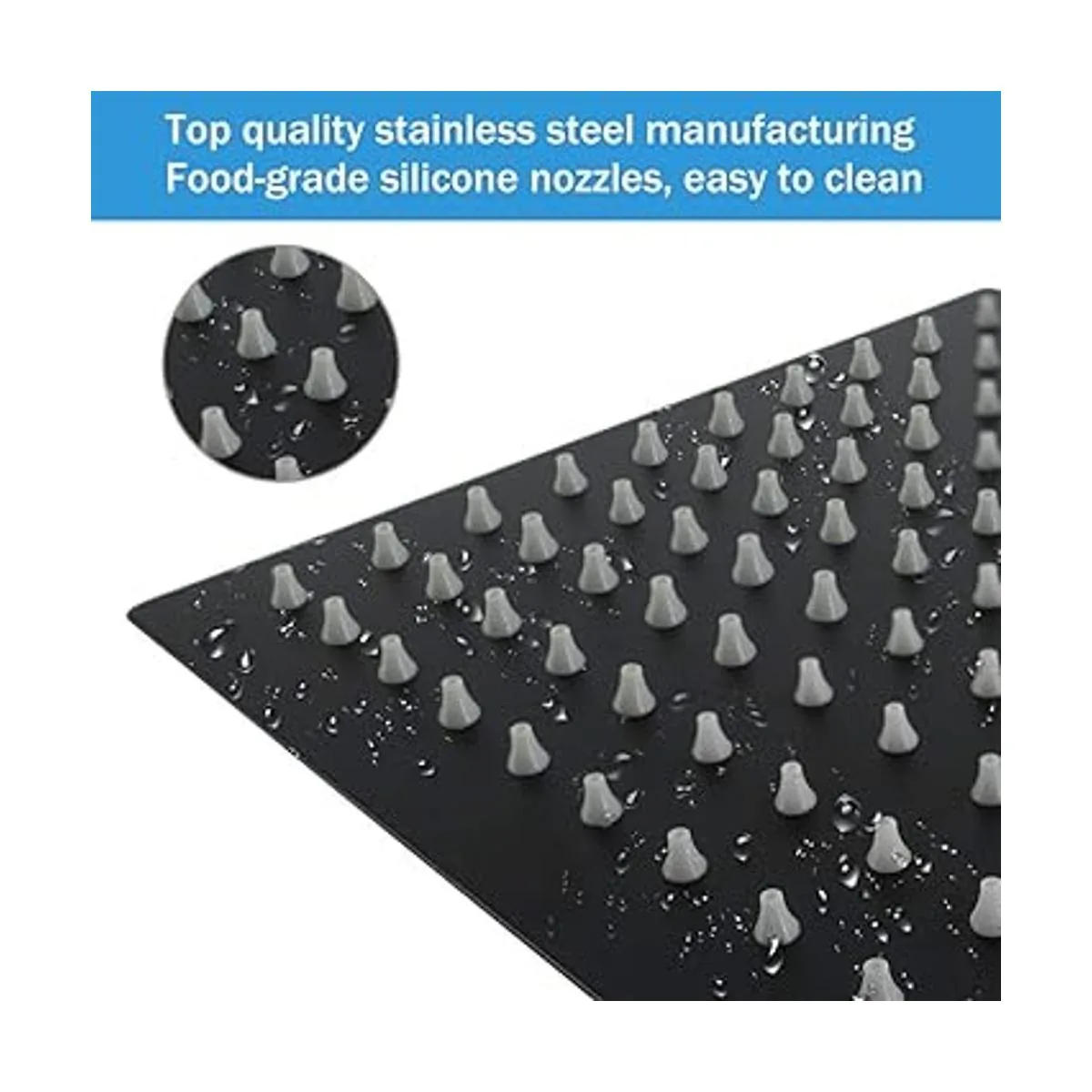 Disfruta de una potente regadera de lluvia incluso en zonas de baja presión, regadera de lluvia extra grande, 90 boquillas de silicona. Con el conector de bola giratorio puedes ajustar y fijar a cualquier ángulo que desees. La combinación de tecnología ultra delgada y de entrada de aire genera una alta presión y un flujo potente. Produce un efecto de lluvia incluso cuando hay baja presión.