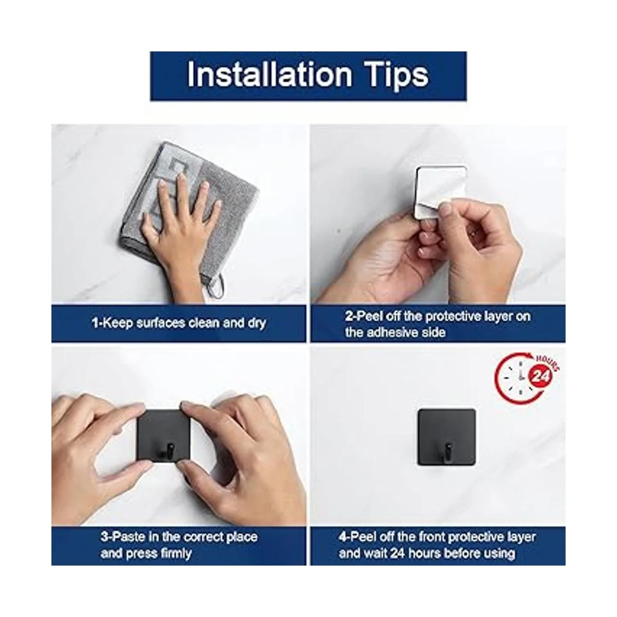 Aspecto moderno y elegante: estos ganchos adhesivos resistentes vienen con tratamiento de proceso de galvanoplastia, acero inoxidable grueso y negro mate no solo reflejan una sensación moderna y elegante, sino que también son más cómodos y cómodos de usar.