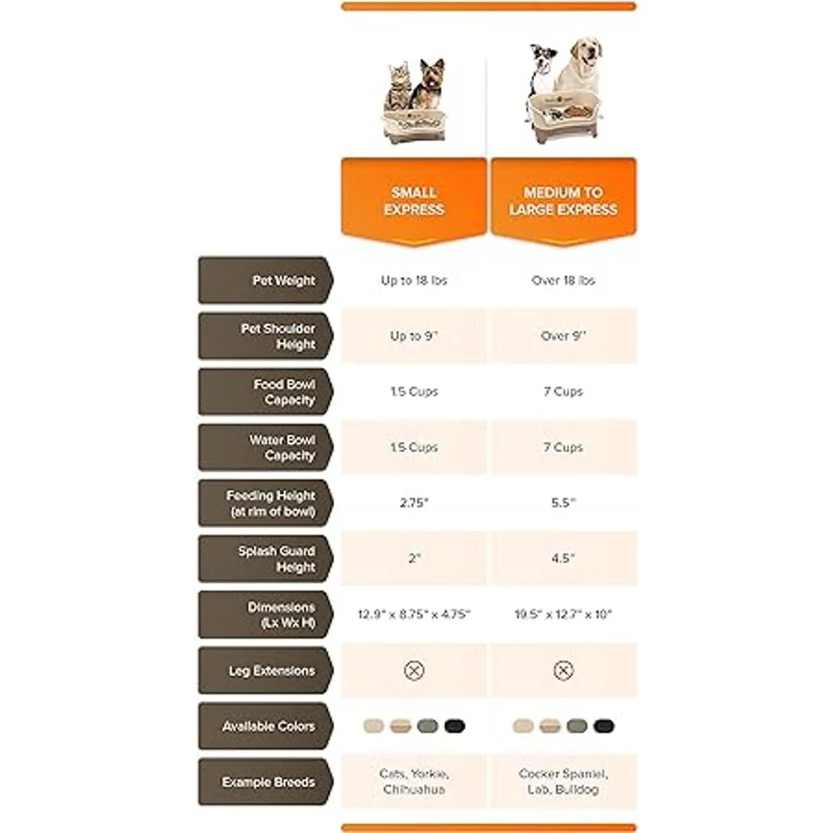 Hecho para perros medianos a grandes: diseñado para razas de perros medianos a grandes de más de 9 pulgadas en el hombro y más de 18 libras de peso. Incluye 2 cuencos de 7 tazas. Aviso legal: Neater Feeder Express no es compatible con ninguna extensión de pierna.
