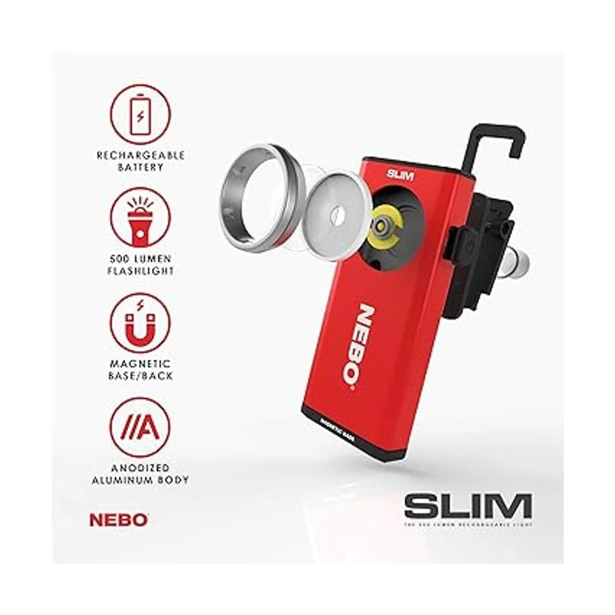 NEBO Luz de trabajo delgada, recargable por USB, luz de bolsillo brillante con clip, gancho y base magnética para iluminación manos libres, portátil, COB, LED, luz de trabajo regulable, linterna de 500 lúmenes, rojo