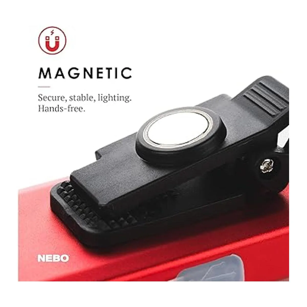 Imanes fuertes: incorporado en el clip y la base del NEBO SLIM hay un fuerte imán que se adhiere a cualquier superficie de metal; esto es perfecto mientras trabajas debajo del capó de tu coche, en tu hogar o en varios otros lugares