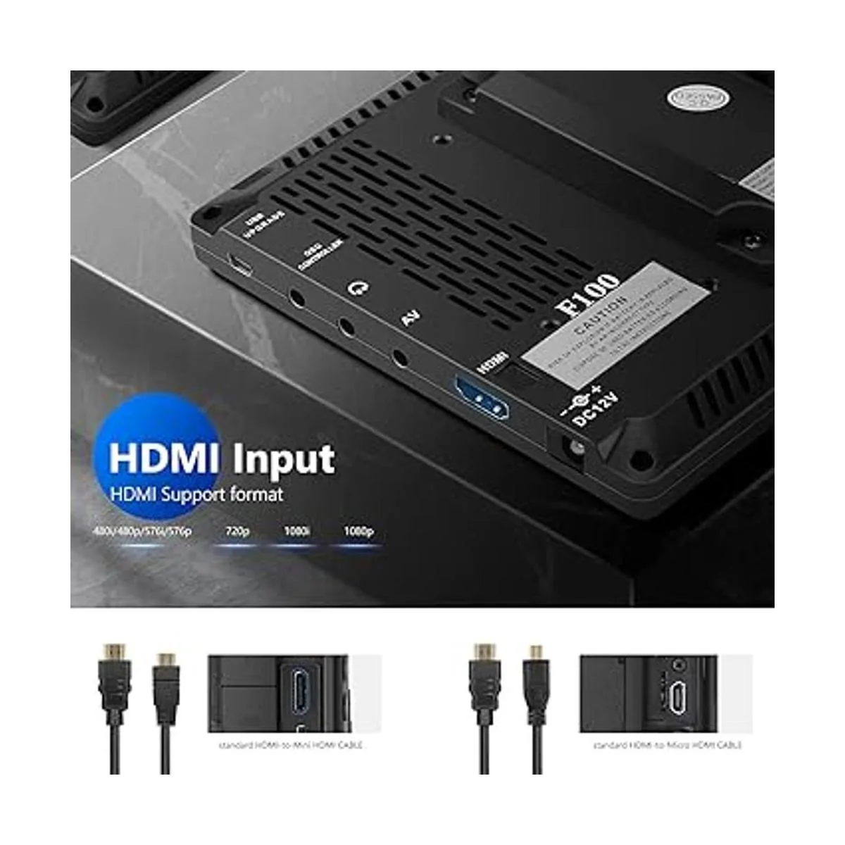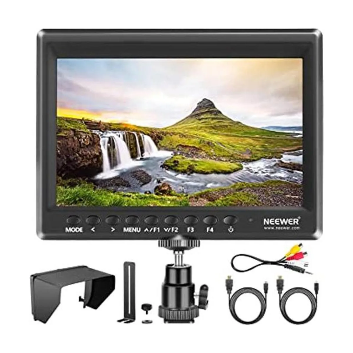 Contenido del paquete: monitor de campo Neewer F100, cable mini HDMI, cable micro HDMI, parasol, mini cabeza de bola, cable AV, manual de usuario idioma español no garantizado